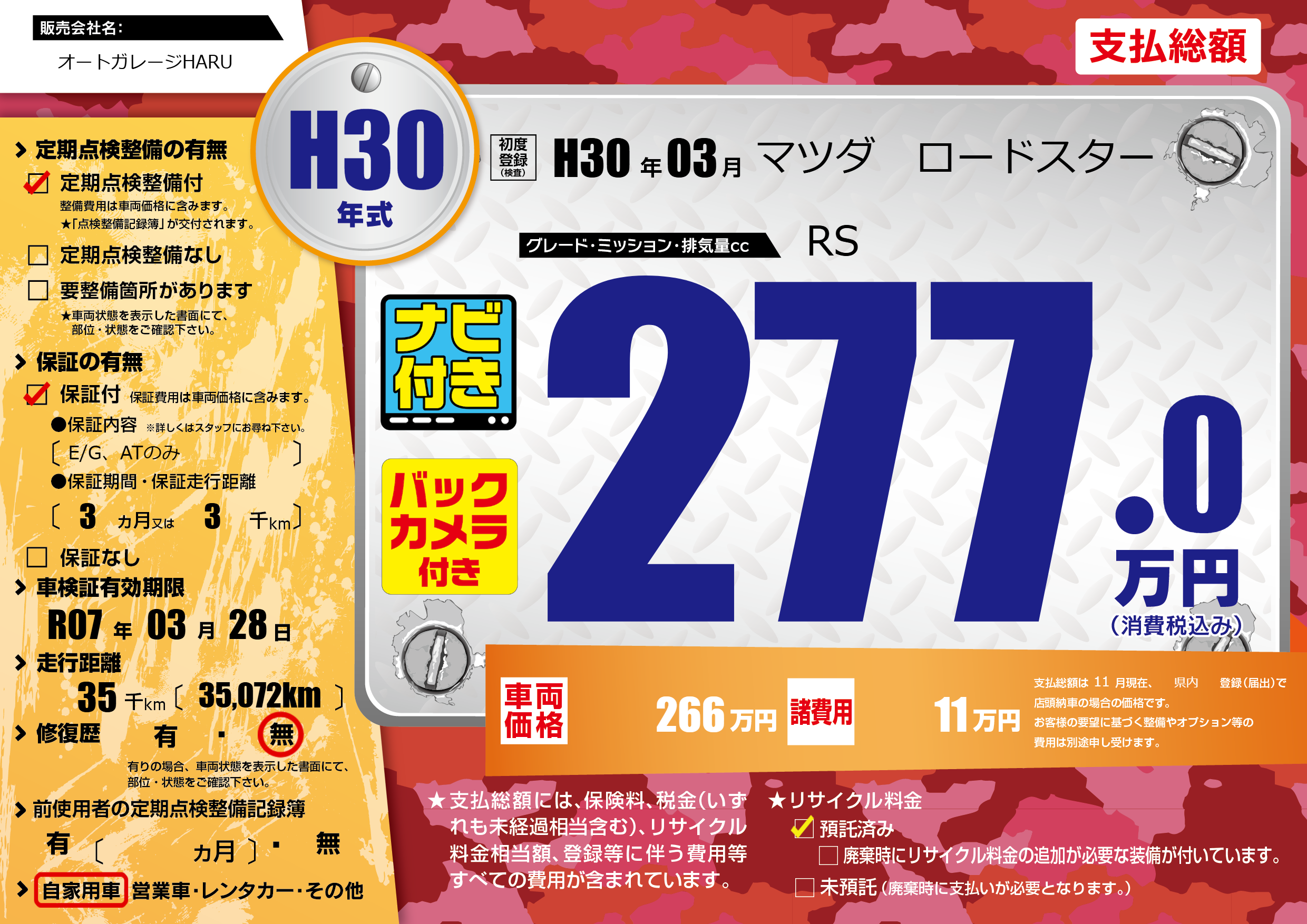 | 車名 | マツダ ロードスター | グレード ミッション 排気量 |