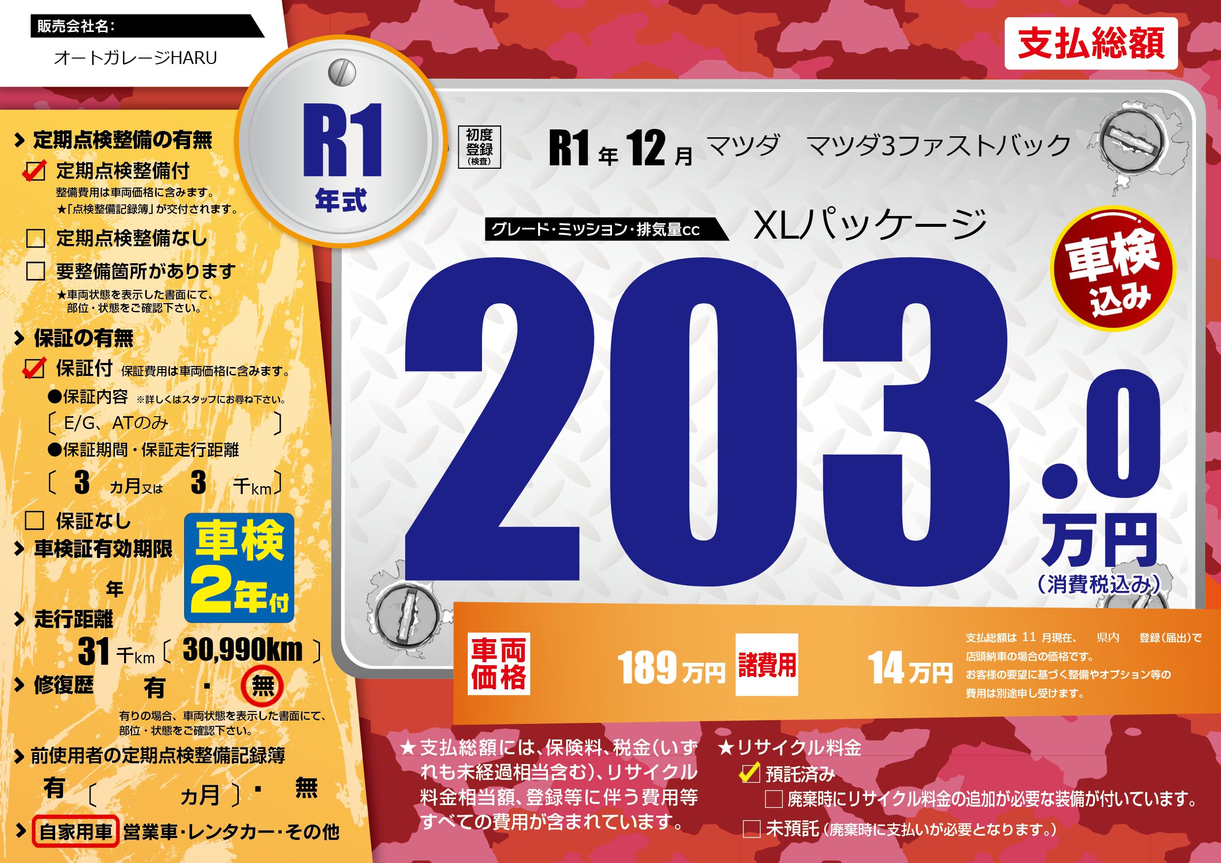 | 走行キロ | 3.1万km | 初年度登録 | R1年12月 |