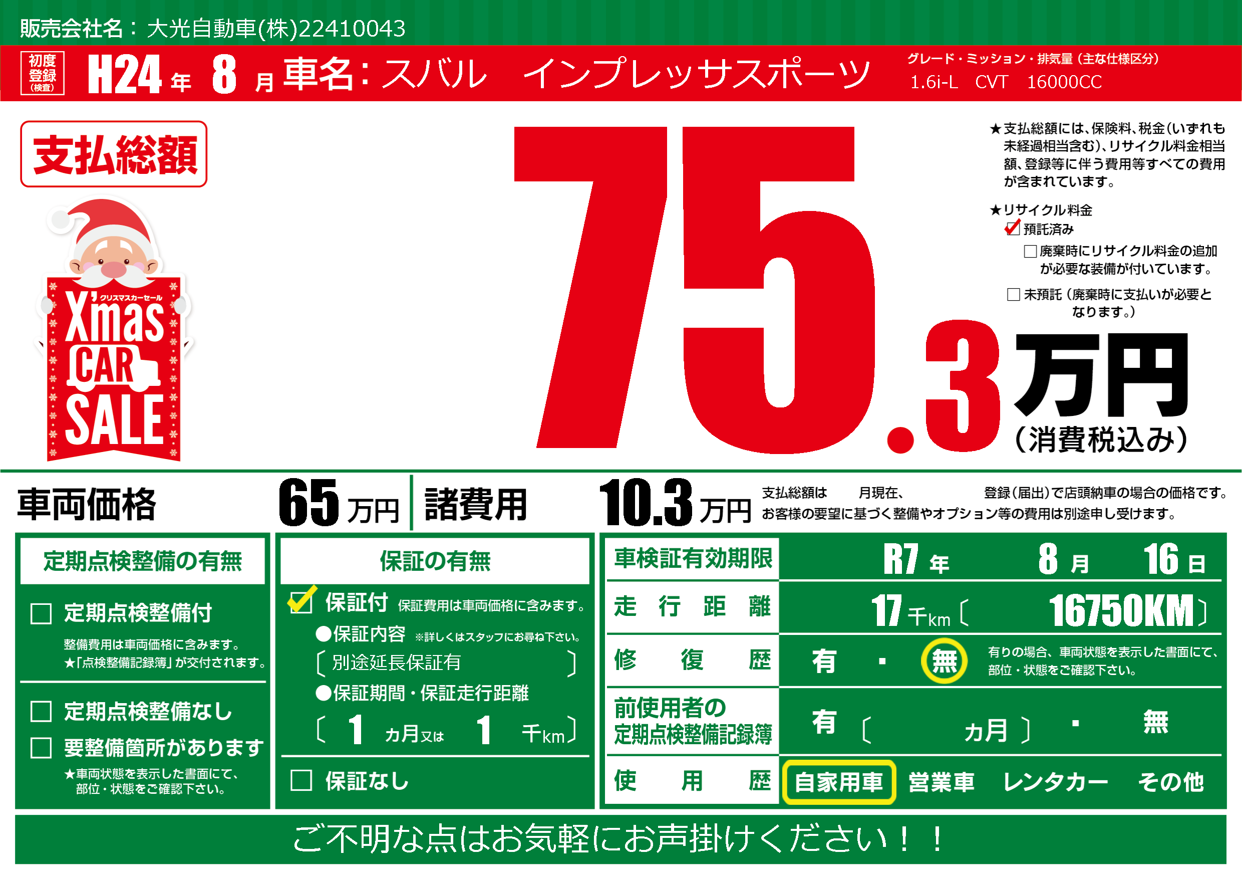 | 車名 | スバル インプレッサスポーツ | グレード ミッション 排気量 |