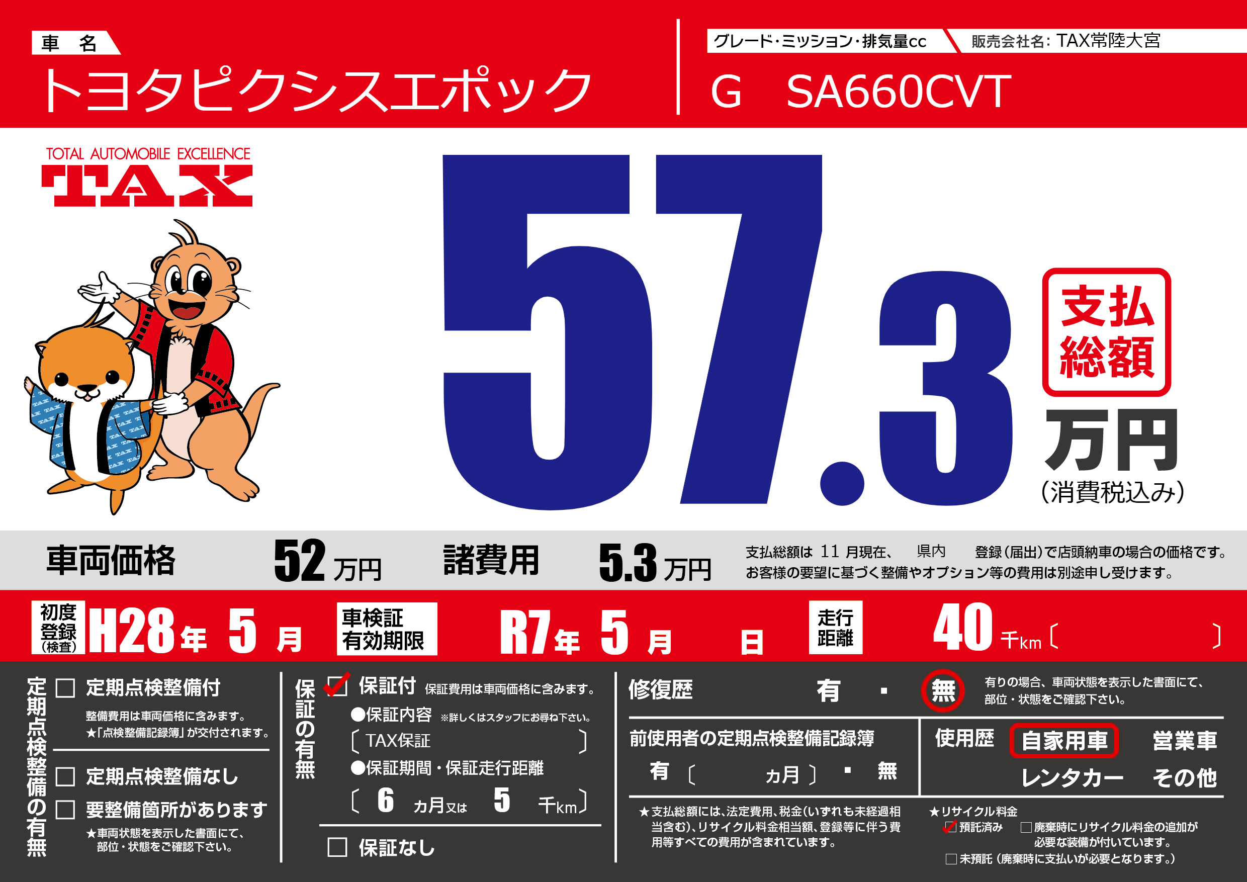 保証付き 保証内容(TAX保証) 6ヶ月または(5)千kmまで |