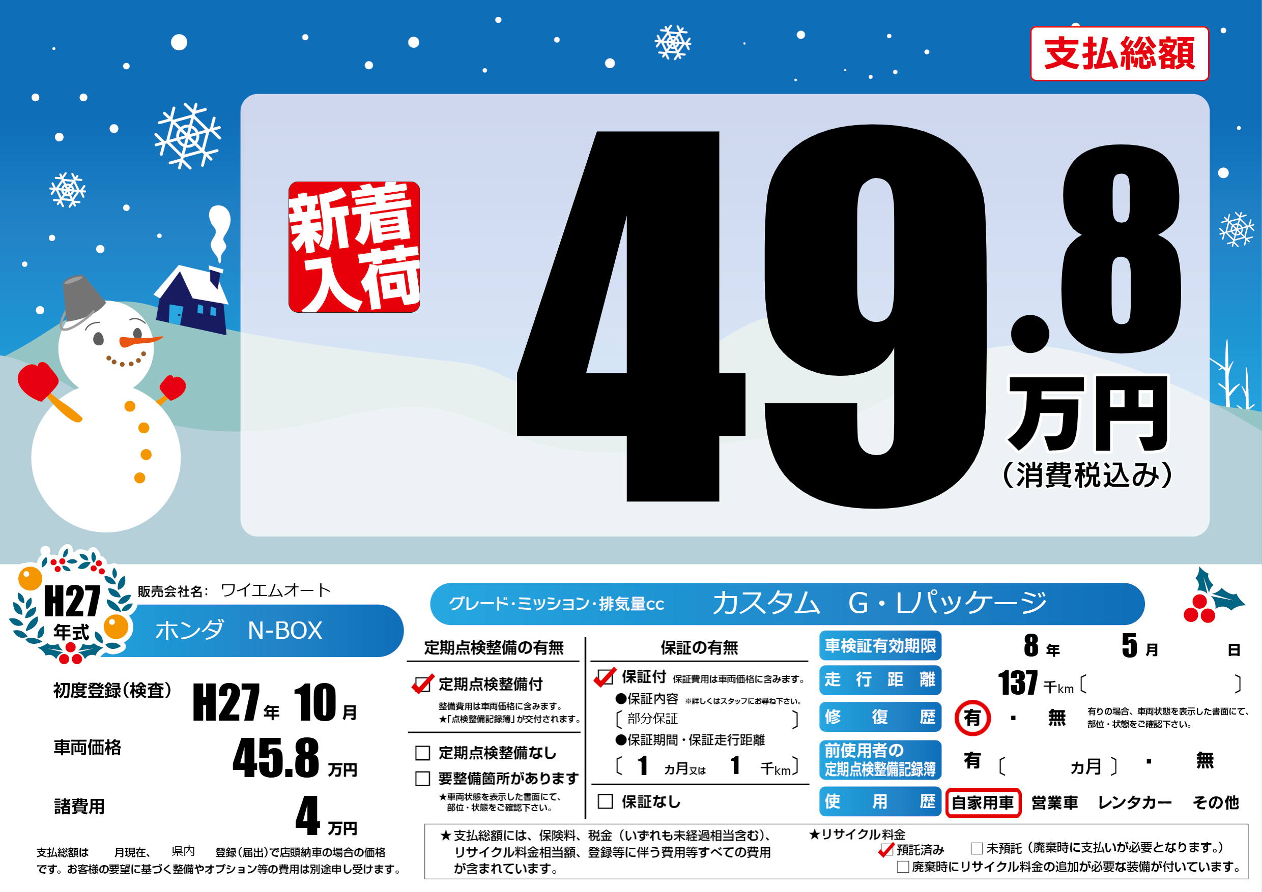 | 車名 | ホンダ N-BOX | グレード ミッション 排気量 |