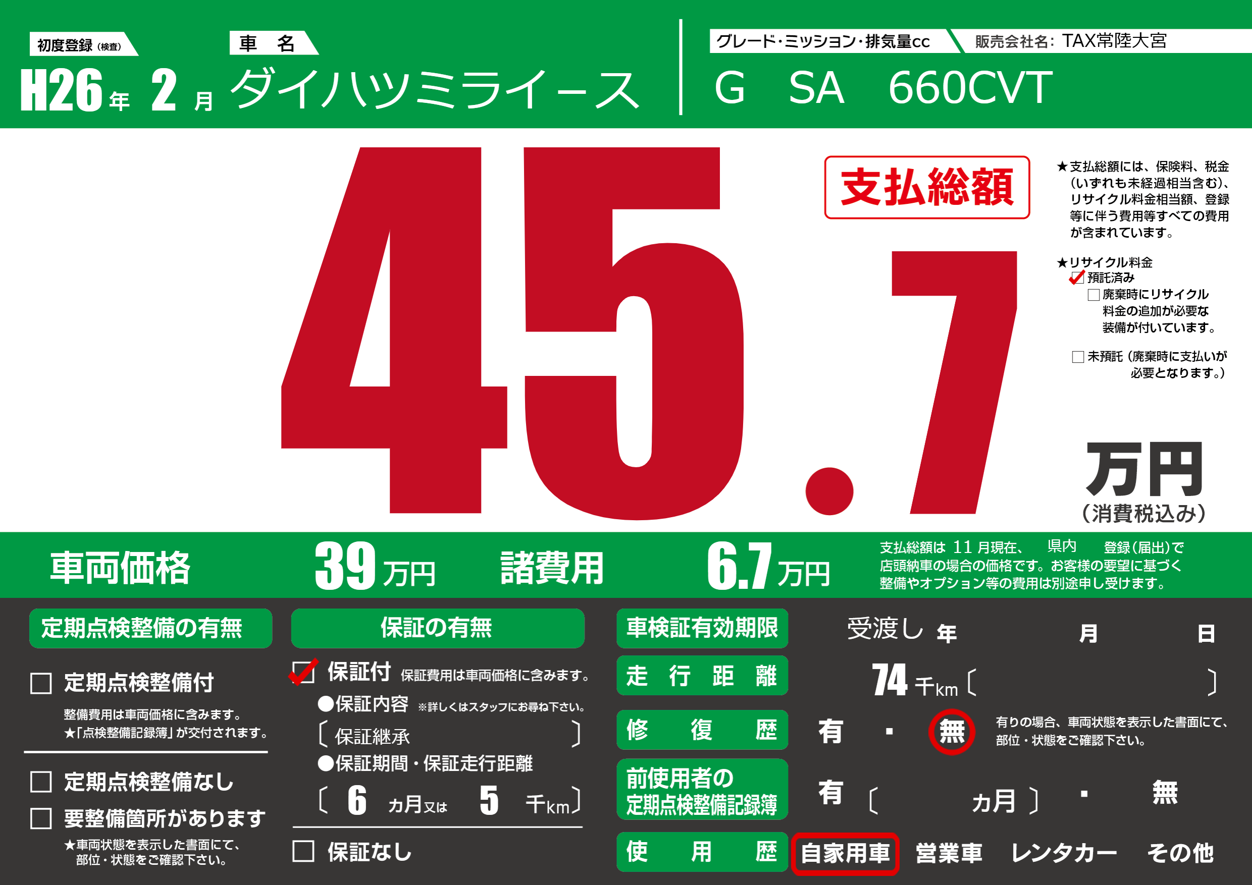 なし | 車検制限 | 受渡し年---月---月 |