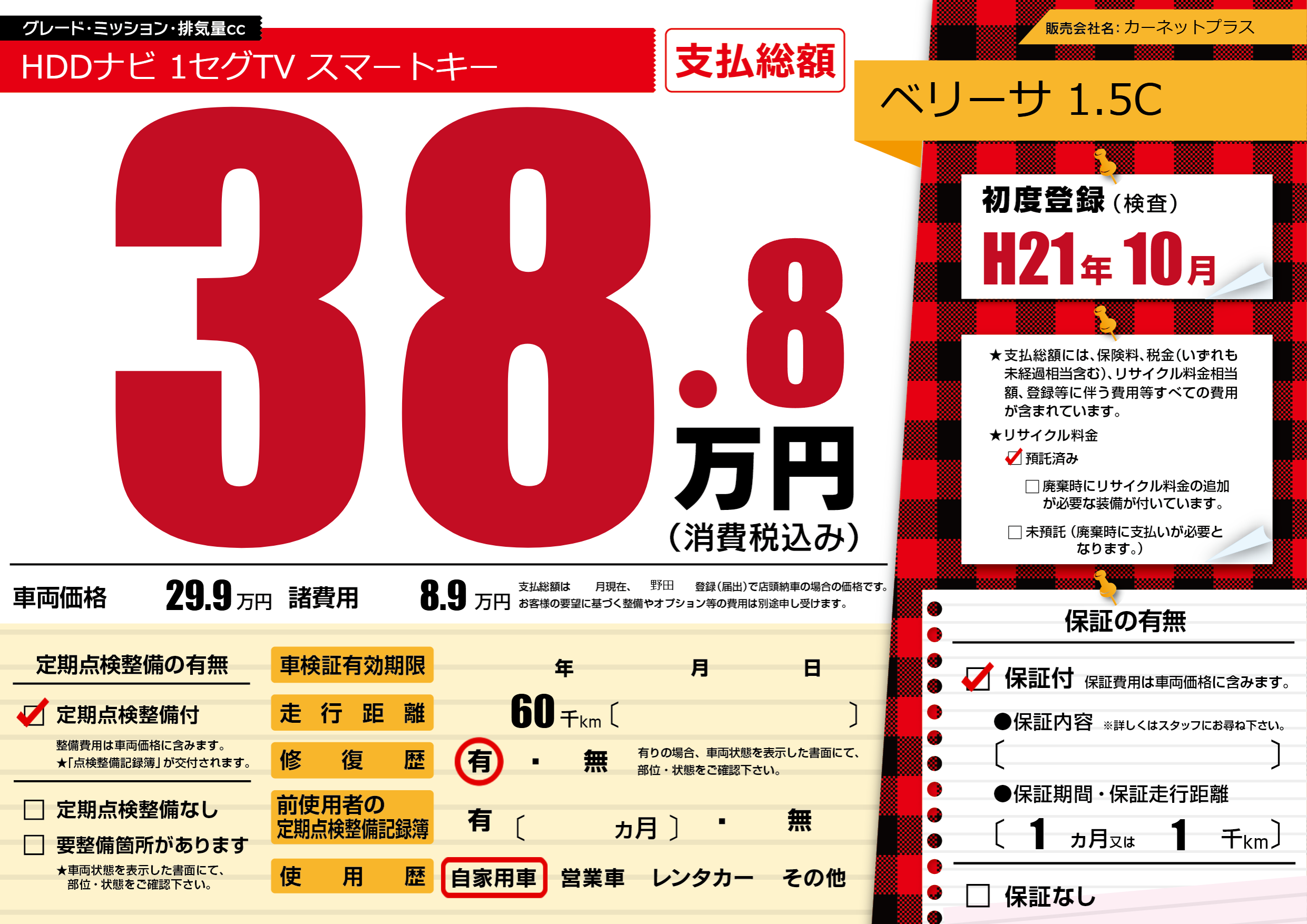 | 車名 | ベリーサ 1.5C | グレード ミッション 排気量 |