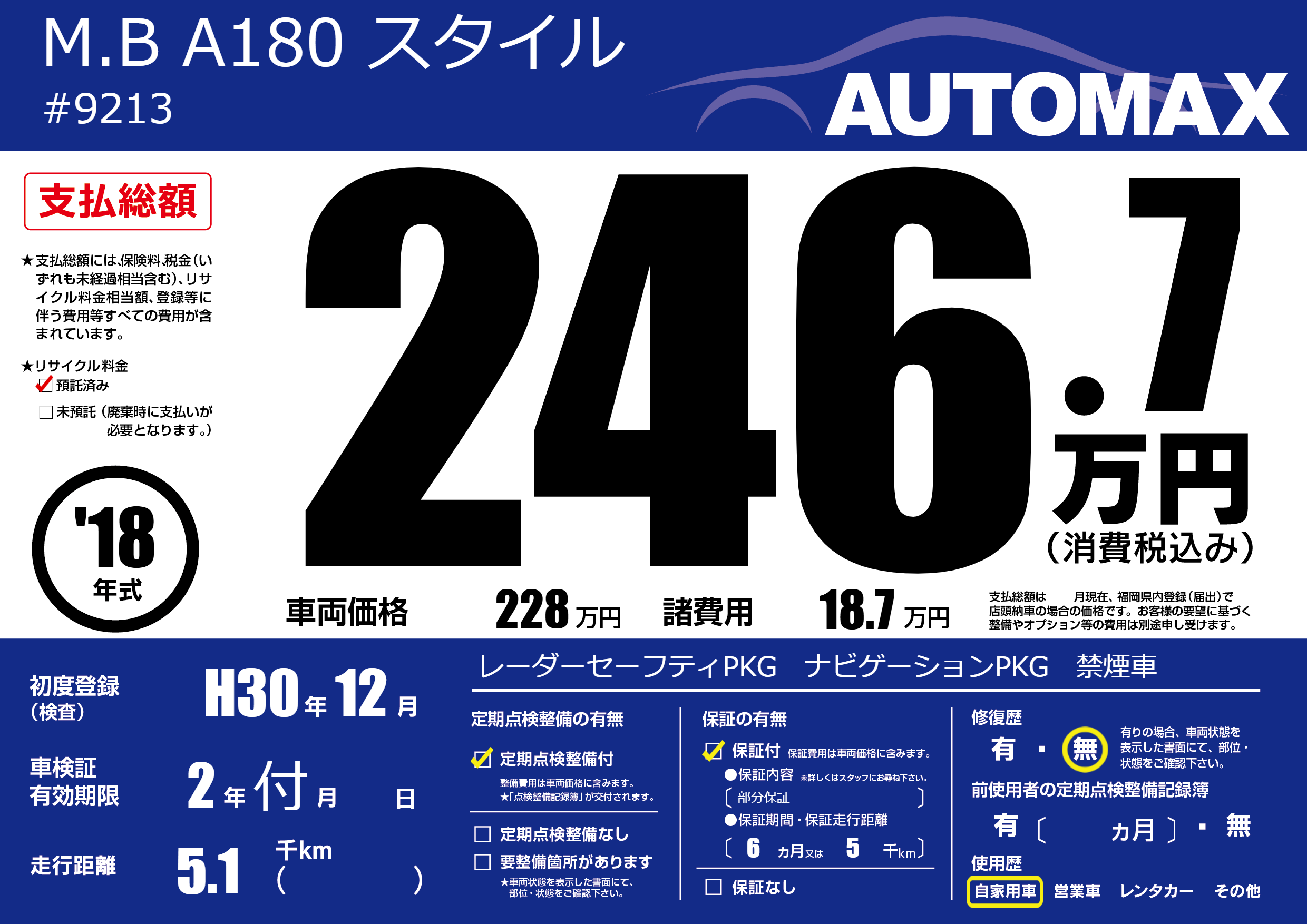 | 走行キロ | 0.5万km | 初年度登録 | H30年12月 |