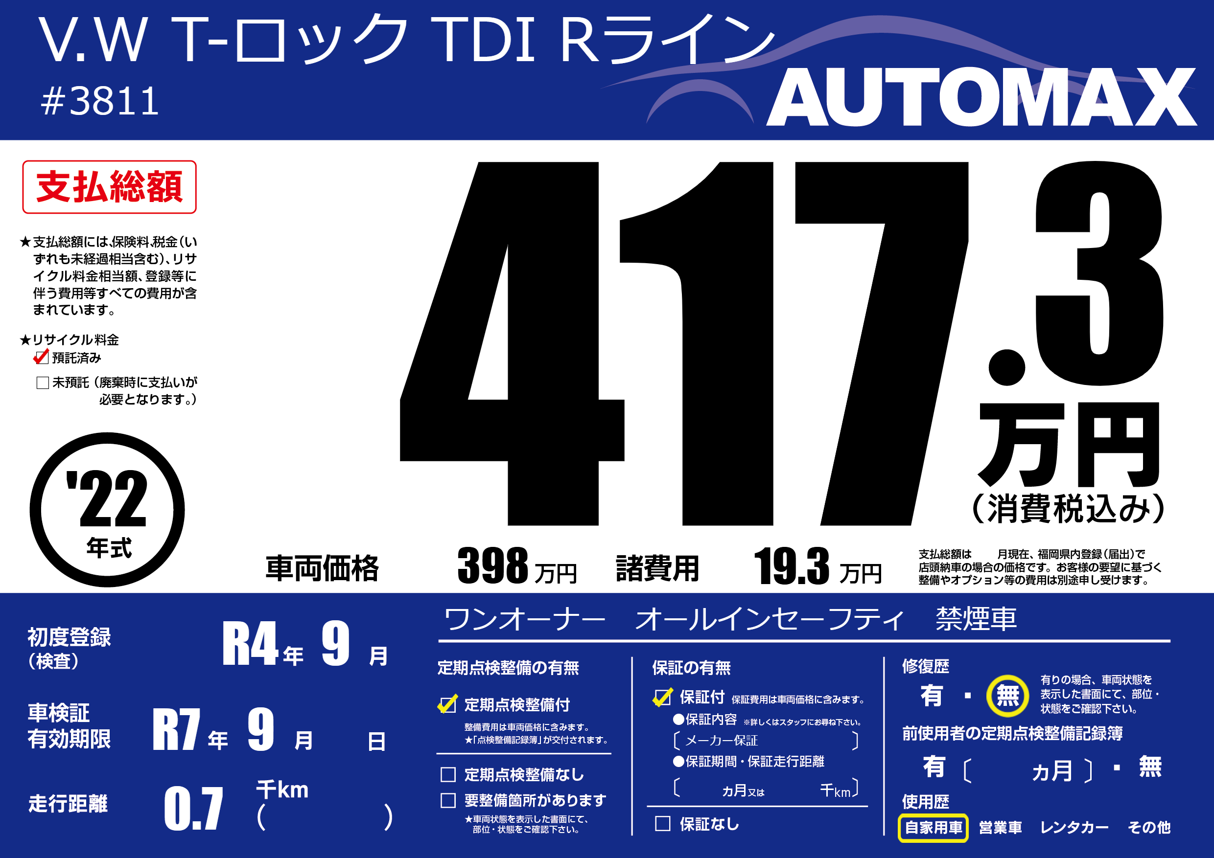 | 車名 | V.W T-ロック TDI Rライン | グレード ミッション 排気量 |