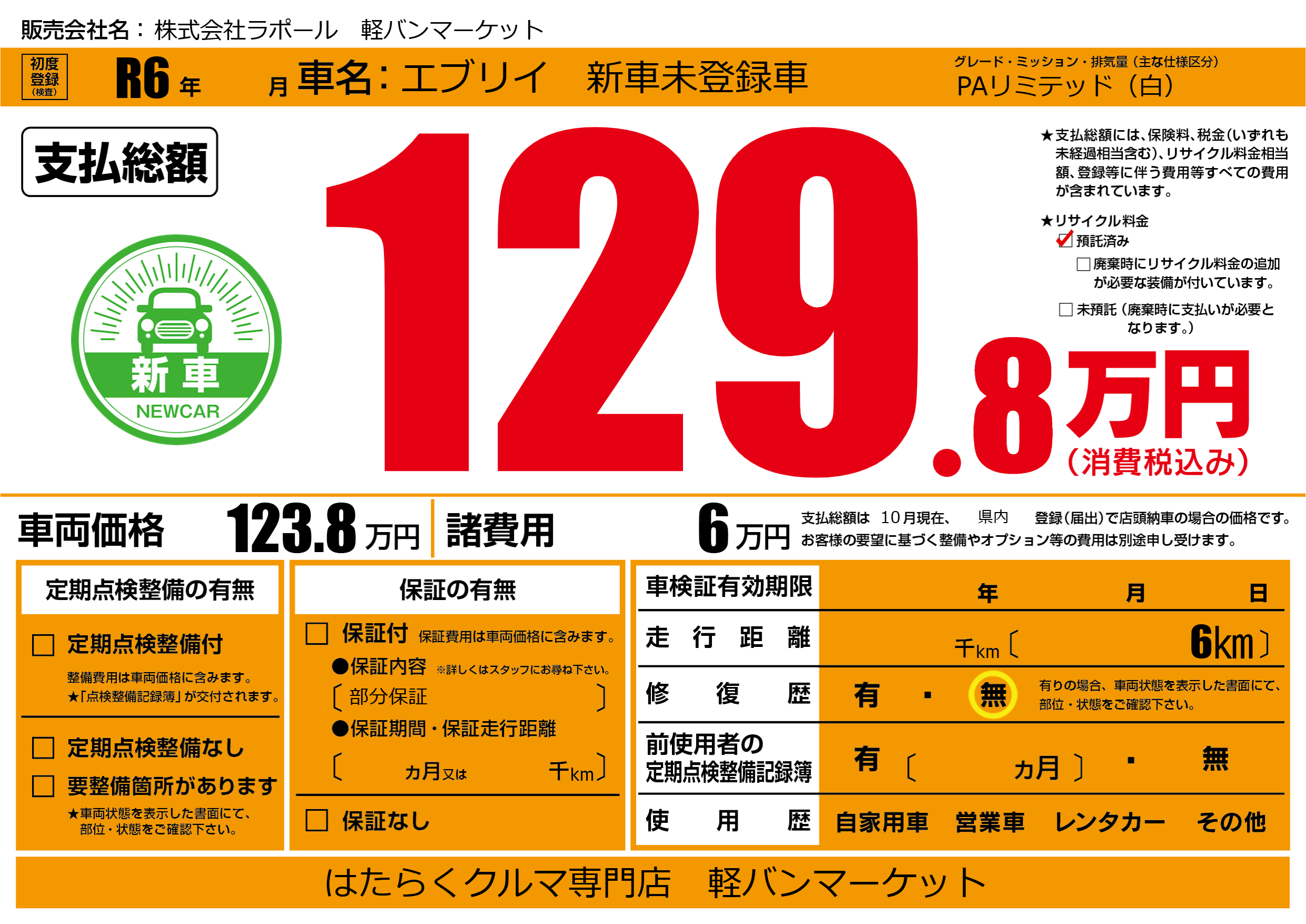 | 車名 | エブリイ 新車未登録車 | グレード ミッション 排気量 |