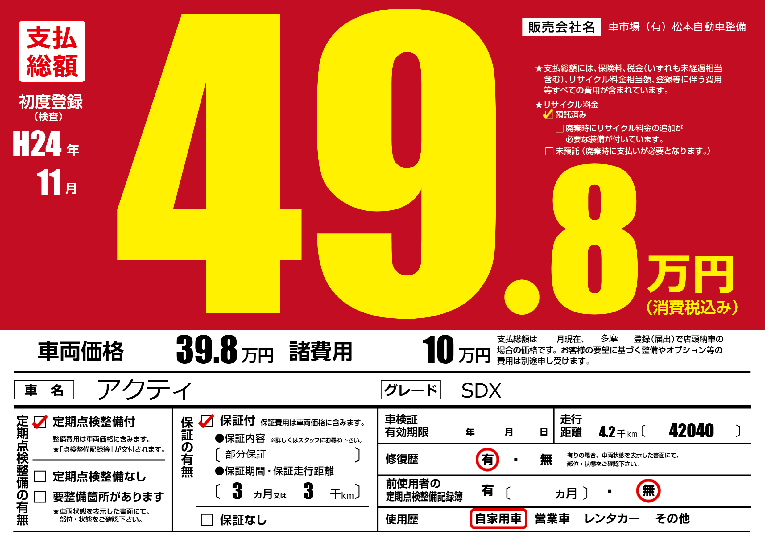 | 車名 | アクティ | グレード ミッション 排気量 |