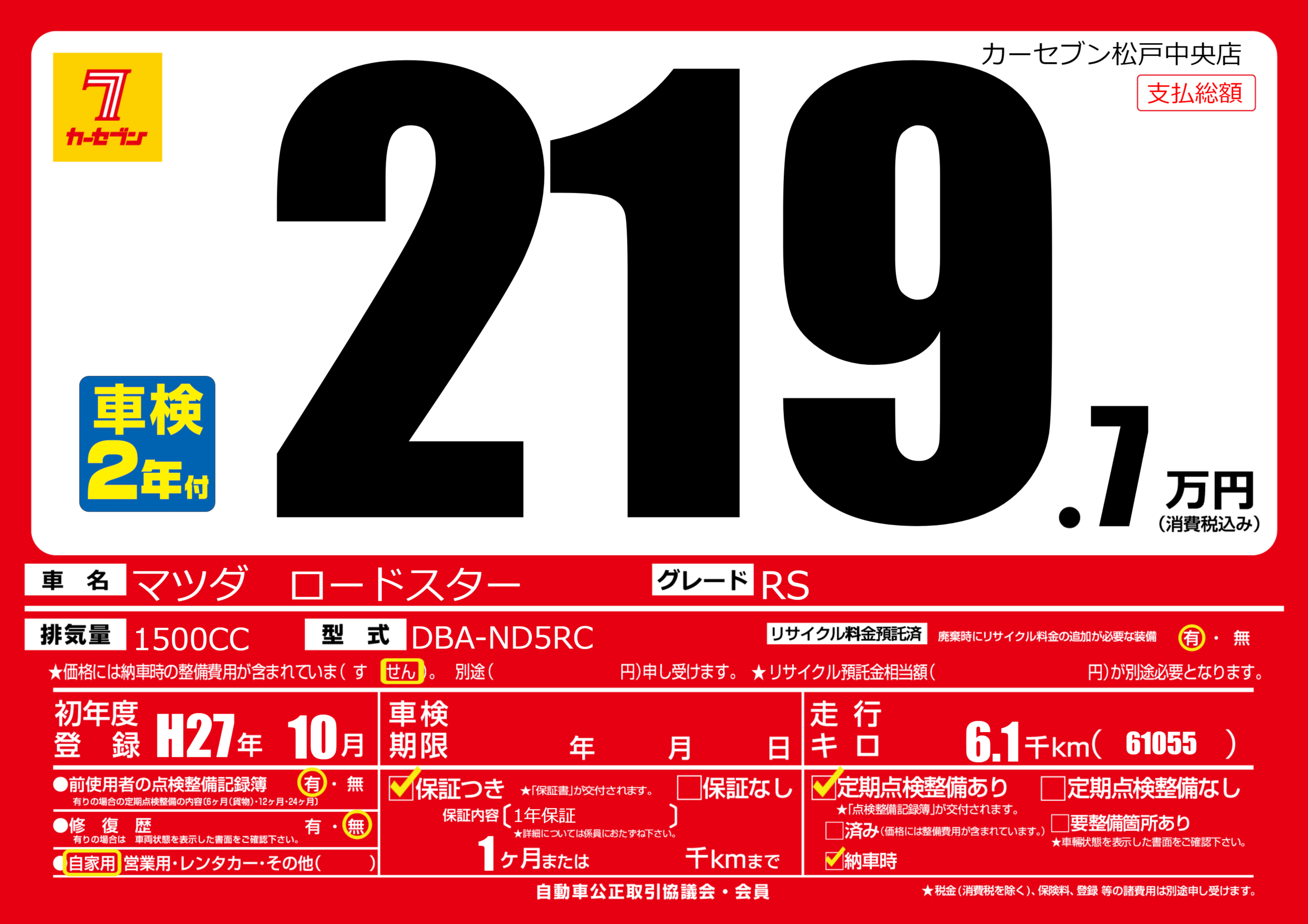| 車名 | マツダ ロードスター | グレード ミッション 排気量 |