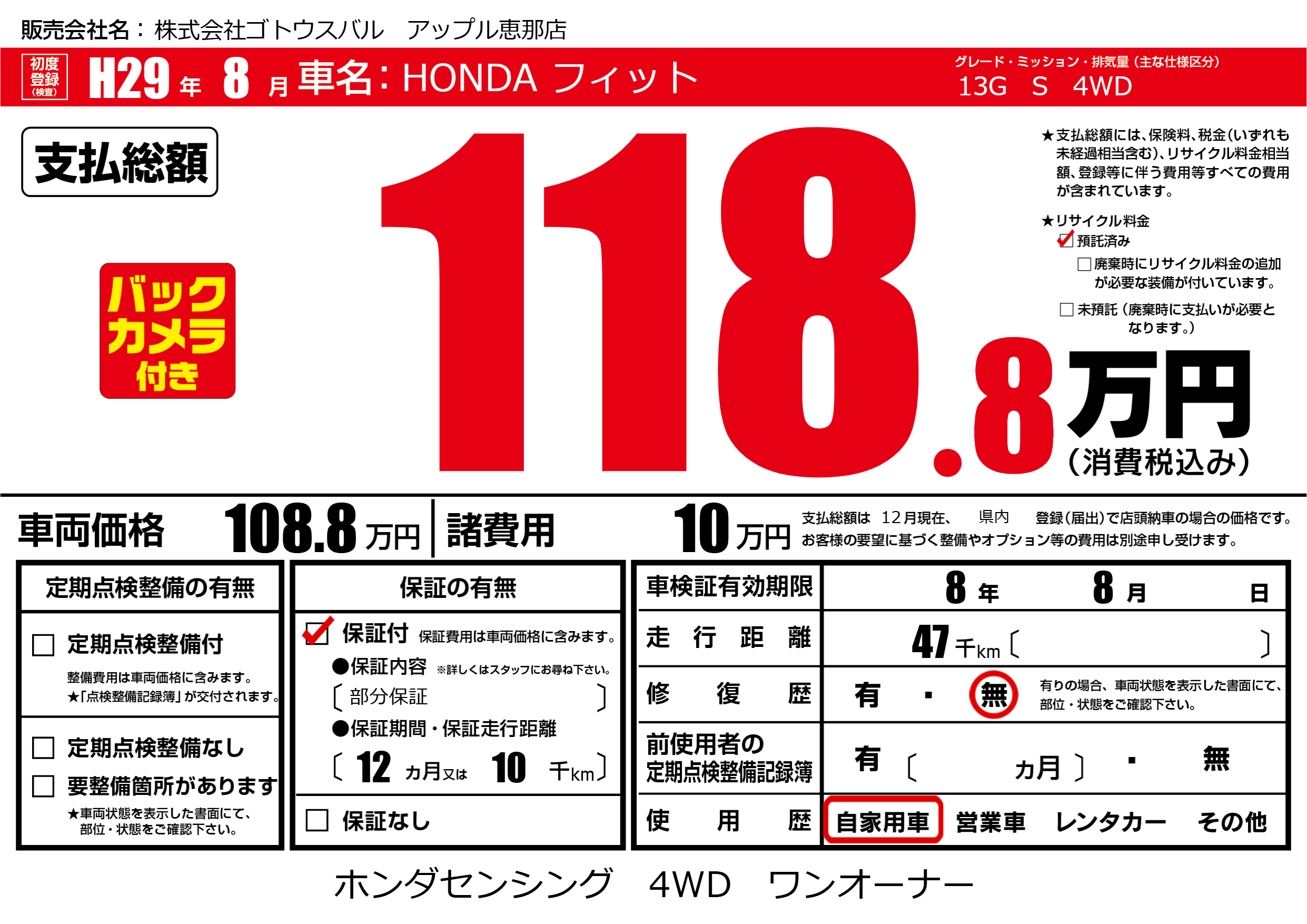 | 車名 | HONDA フィット | グレード ミッション 排気量 |
