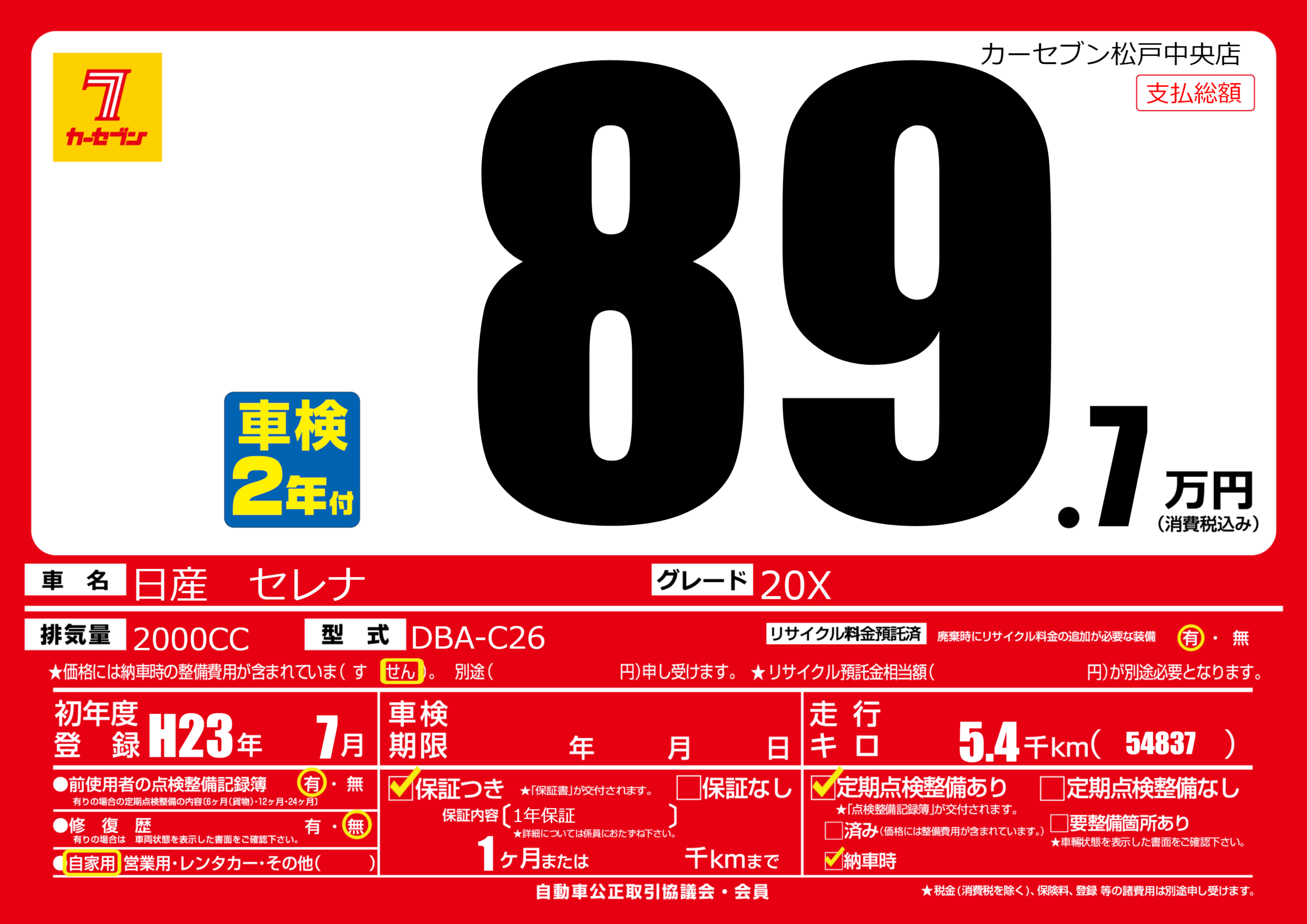 | 車名 | 日産 セレナ | グレード ミッション 排気量 |