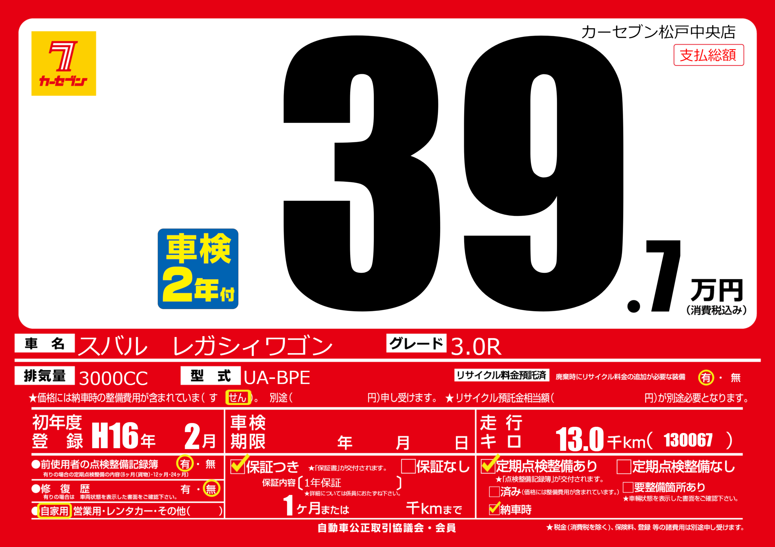| 車名 | スバル レガシィワゴン | グレード ミッション 排気量 |