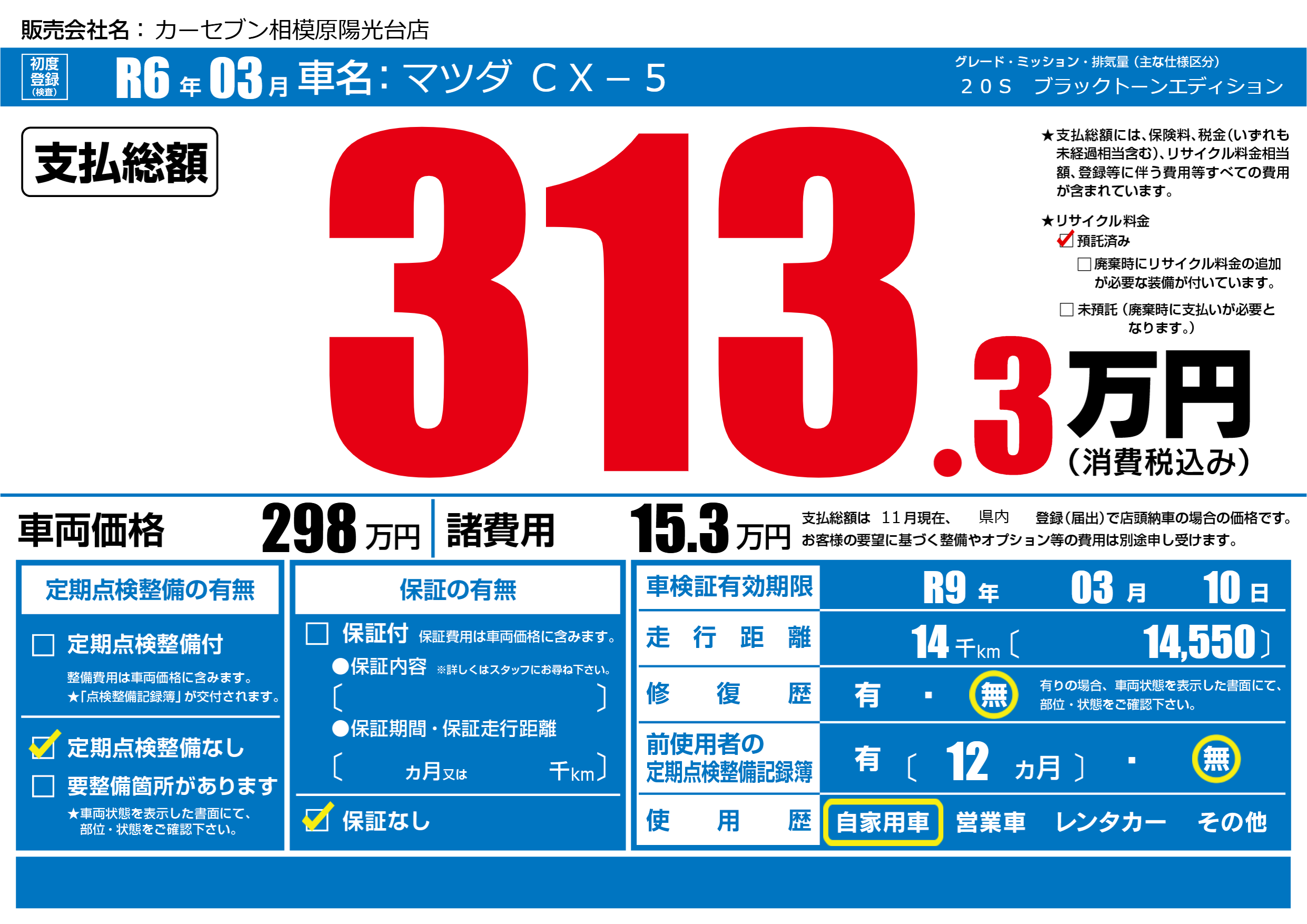 | 車名 | マツダ CX-5 | グレード ミッション 排気量 |