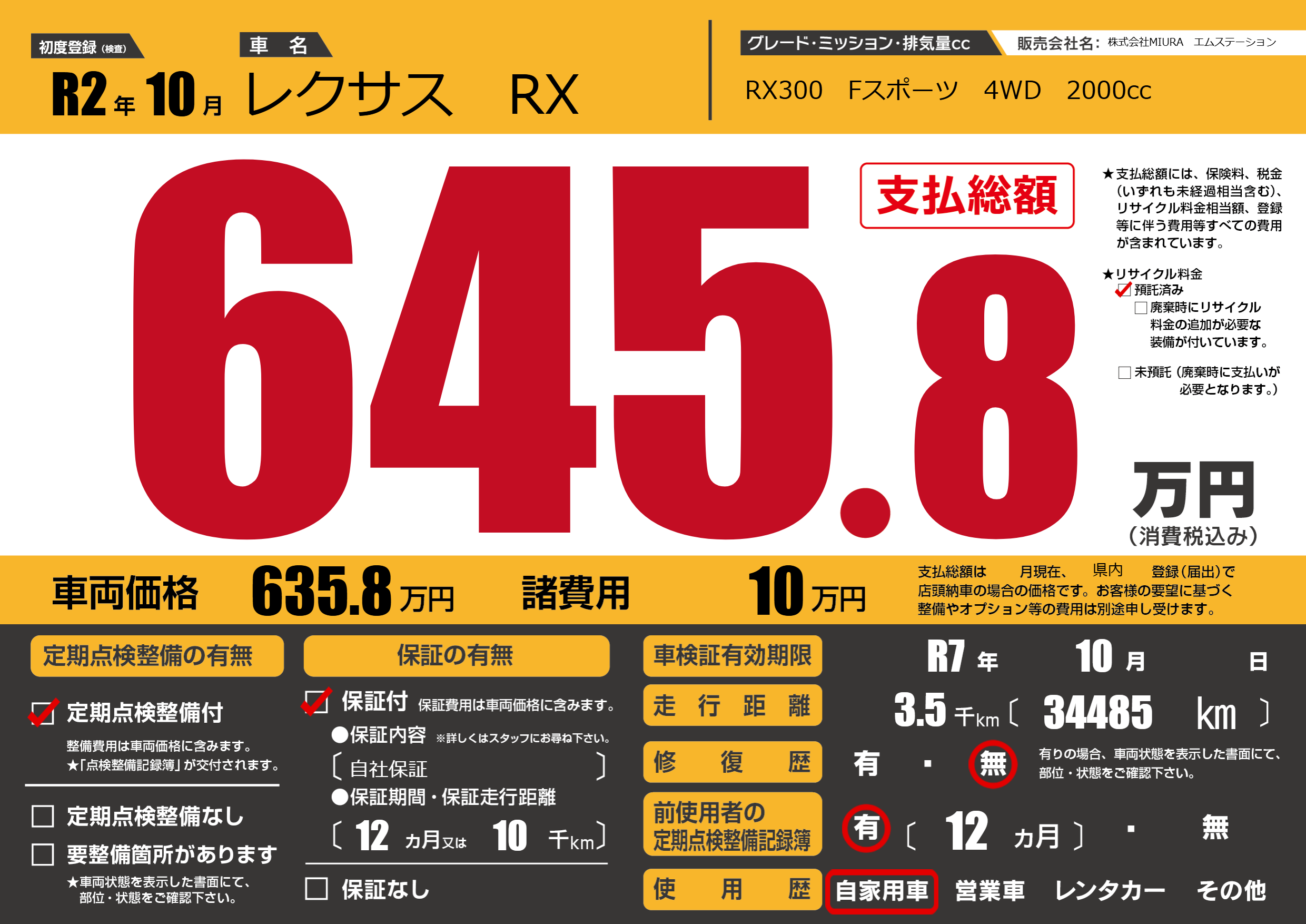 | 走行キロ | 0.3万km | 初年度登録 | R2年10月 |