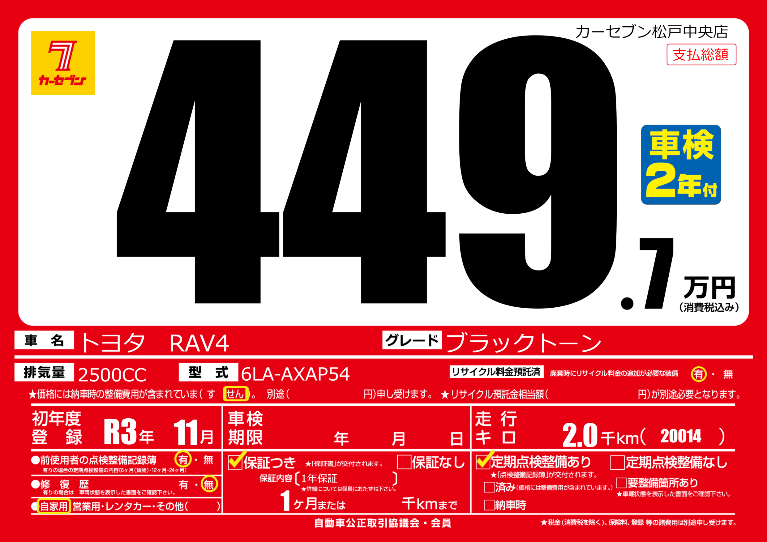 | 車名 | トヨタ RAV4 | グレード ミッション 排気量 |