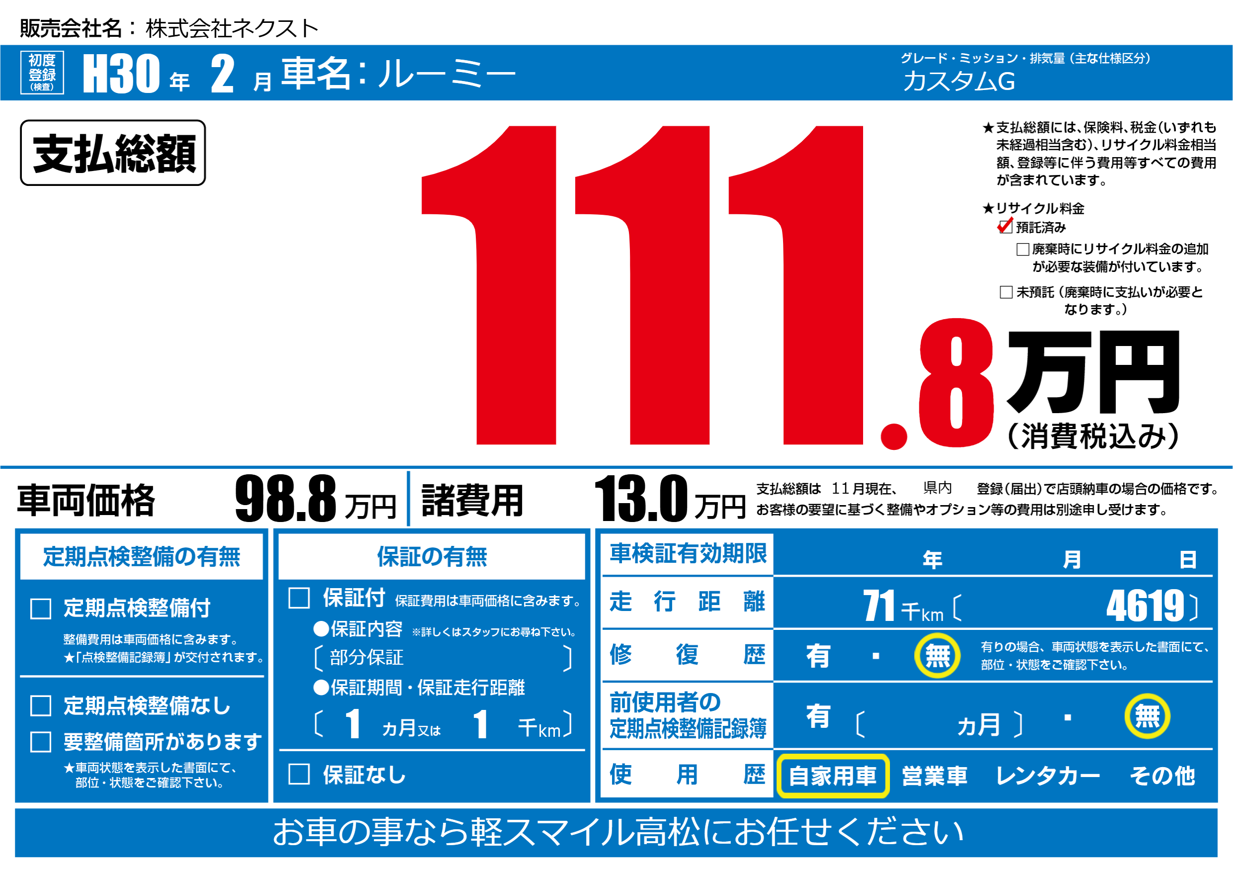 | 車名 | ルーミー | グレード ミッション 排気量 |