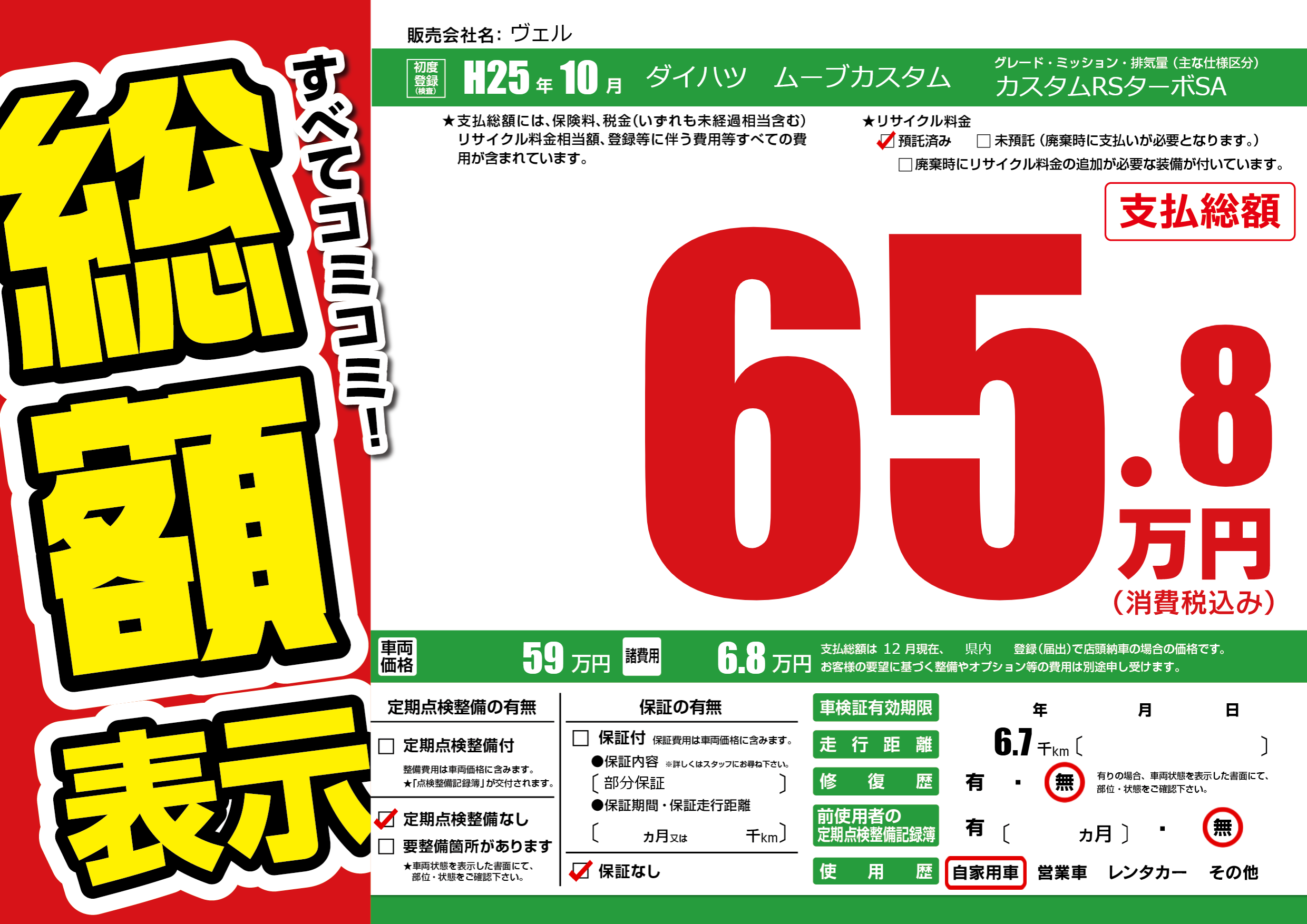 | 走行キロ | 0.6万km | 初年度登録 | H25年10月 |