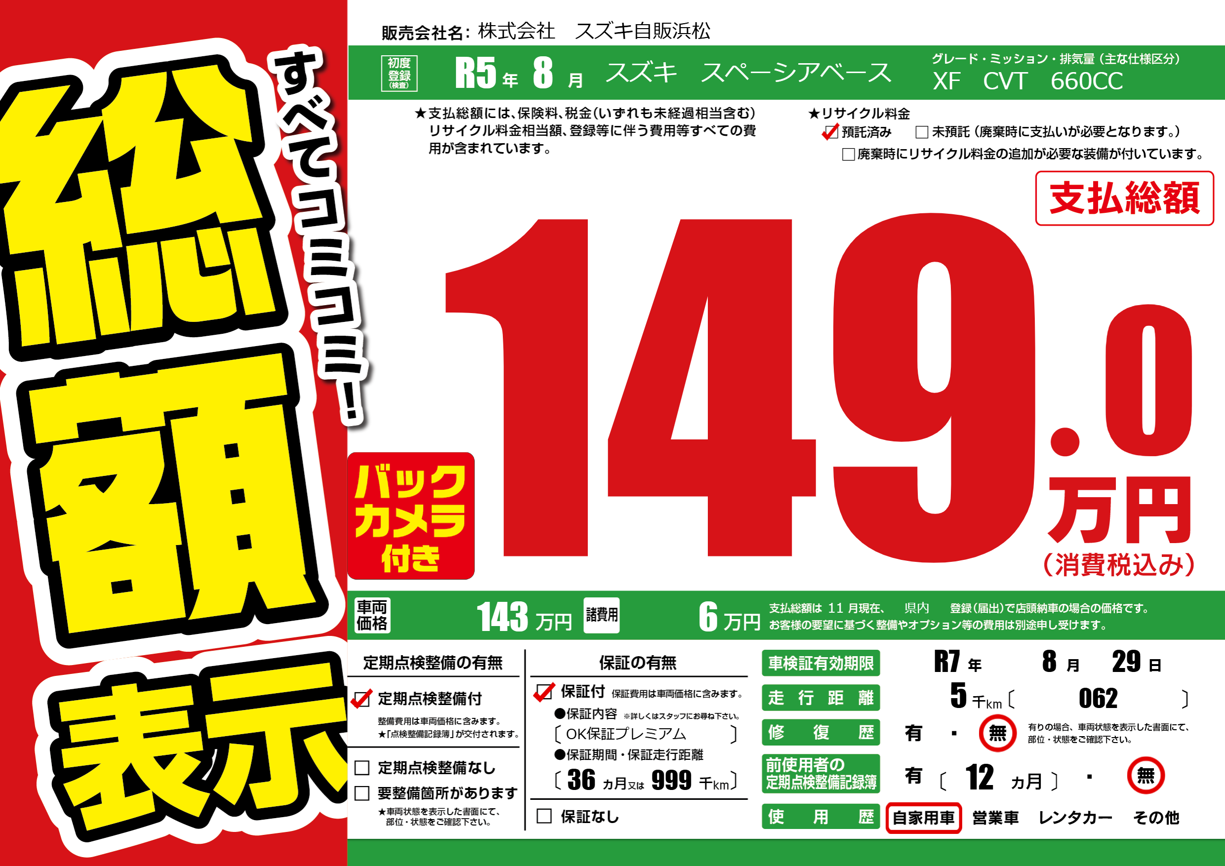 | 車名 | スズキ スペーシアベース | グレード ミッション 排気量 |