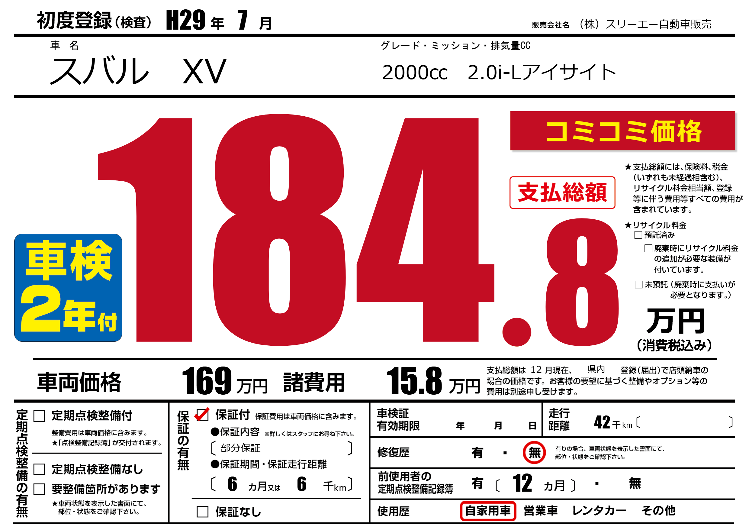 | 車名 | スバル XV | グレード ミッション 排気量 |
