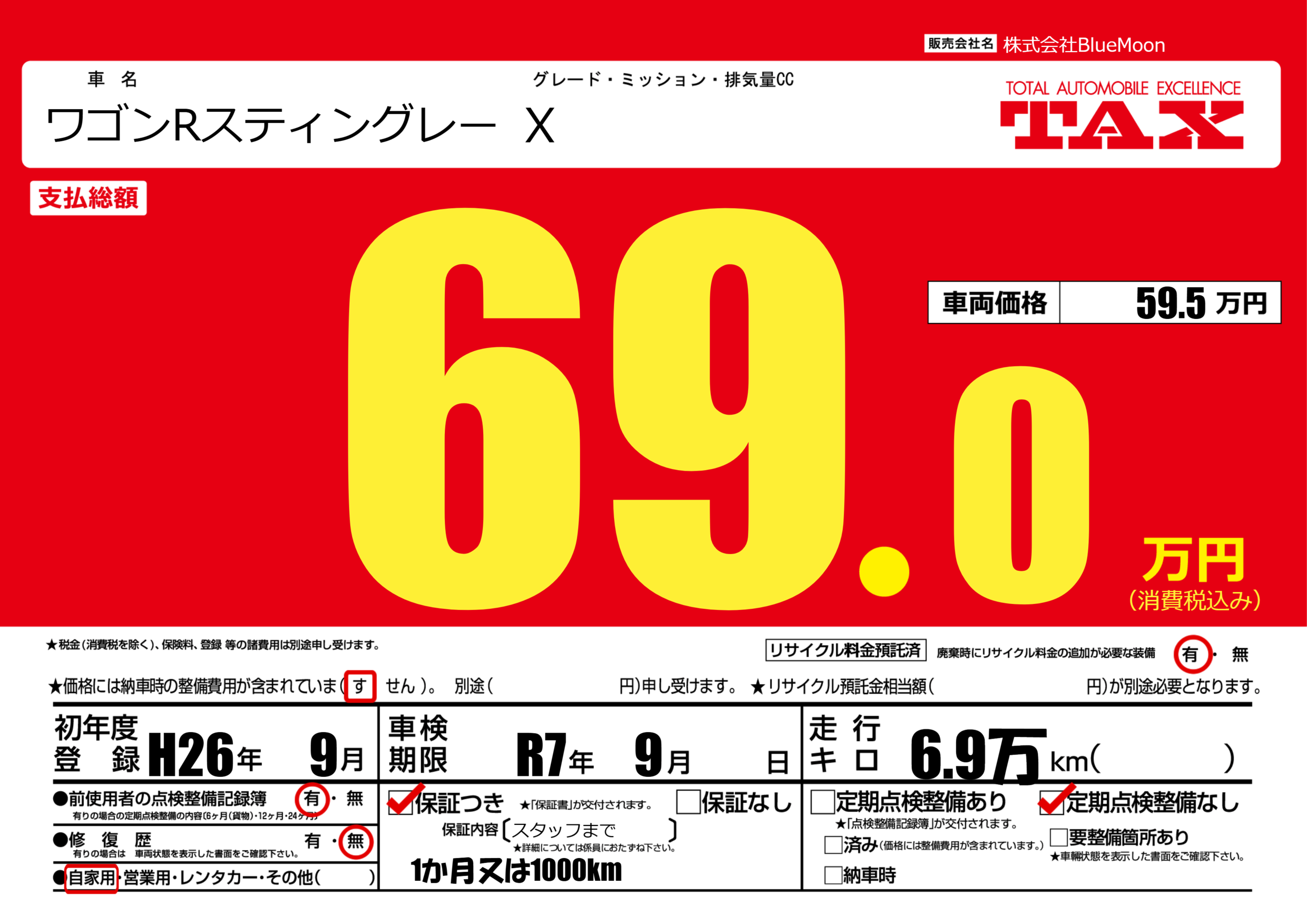 | 車名 | ワゴンRスティングレー | グレード ミッション 排気量 |