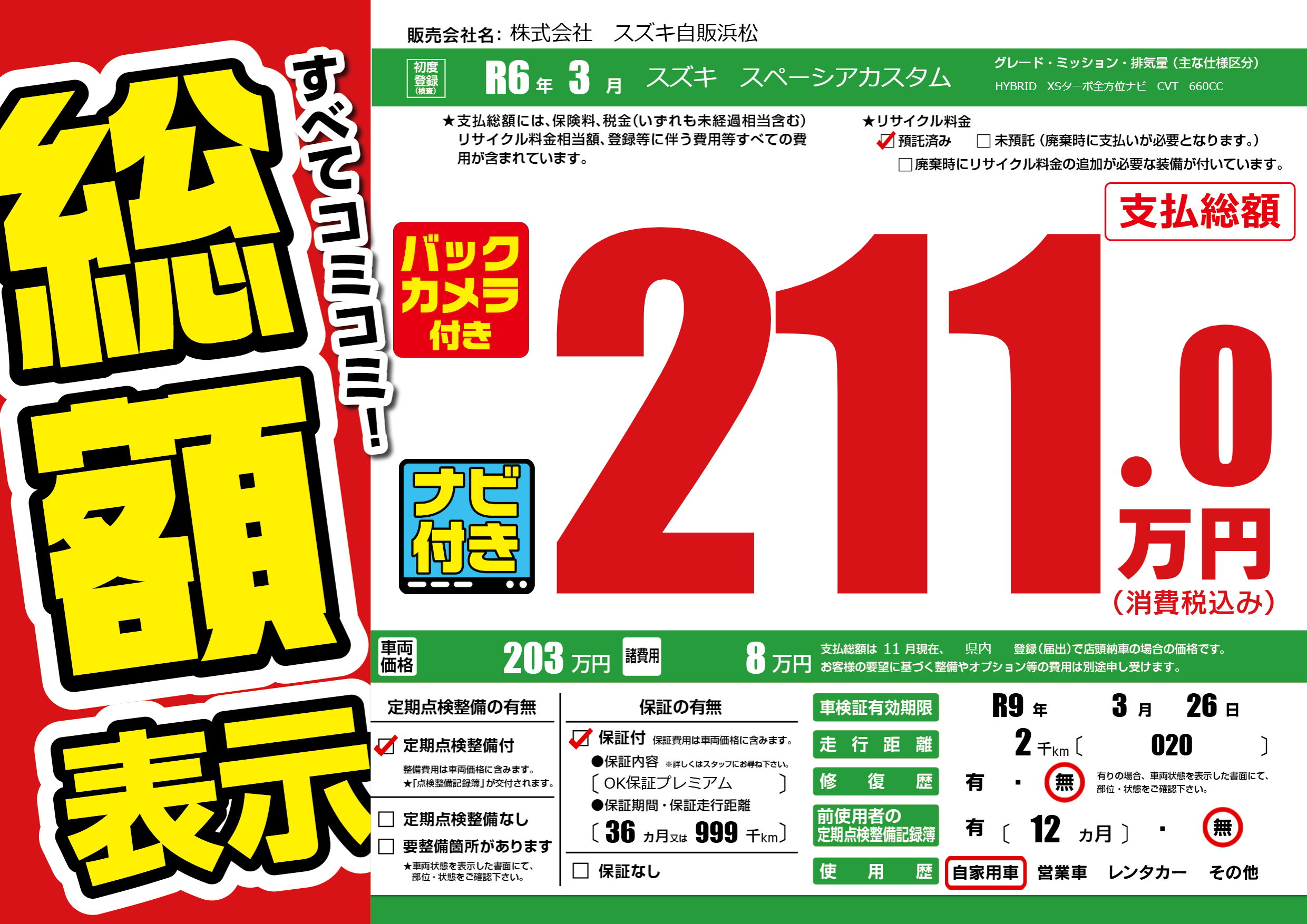 | 車名 | スズキ スペーシアカスタム | グレード ミッション 排気量 |