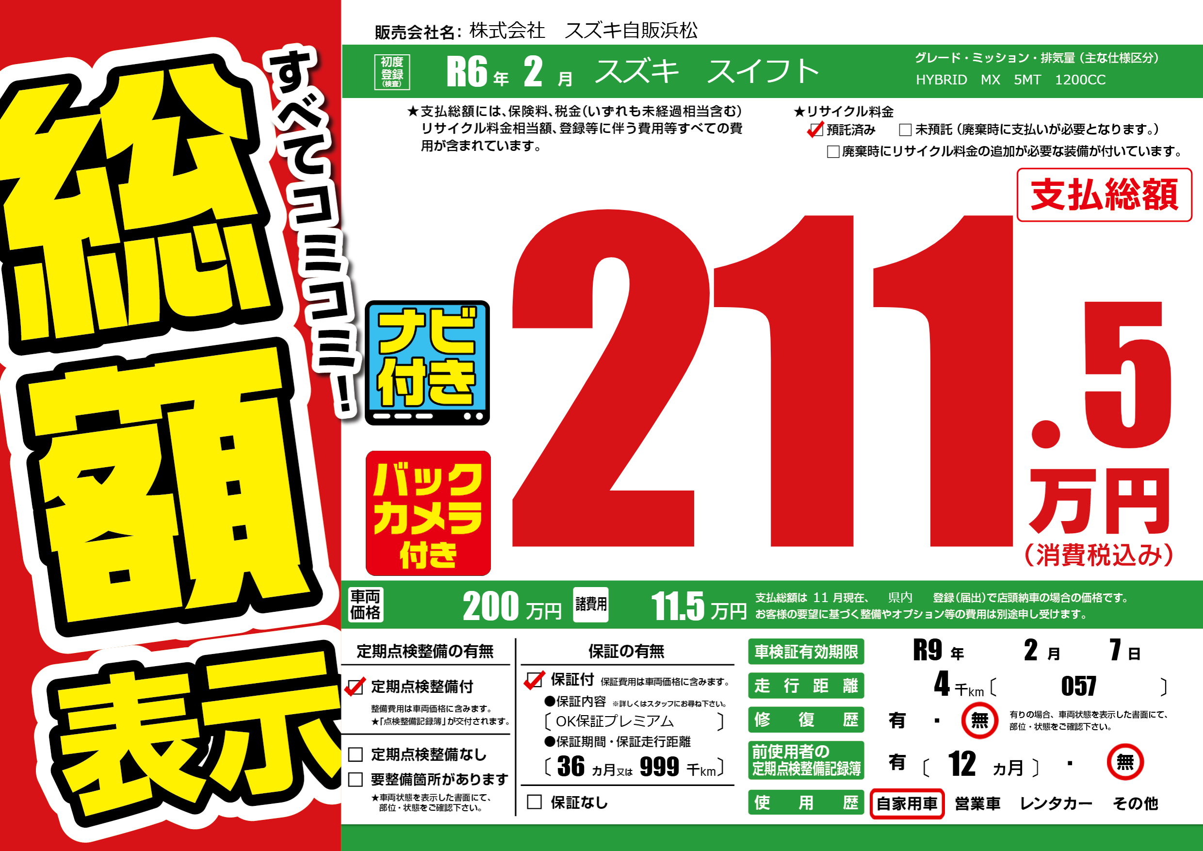 | 車名 | スズキ スイフト | グレード ミッション 排気量 |