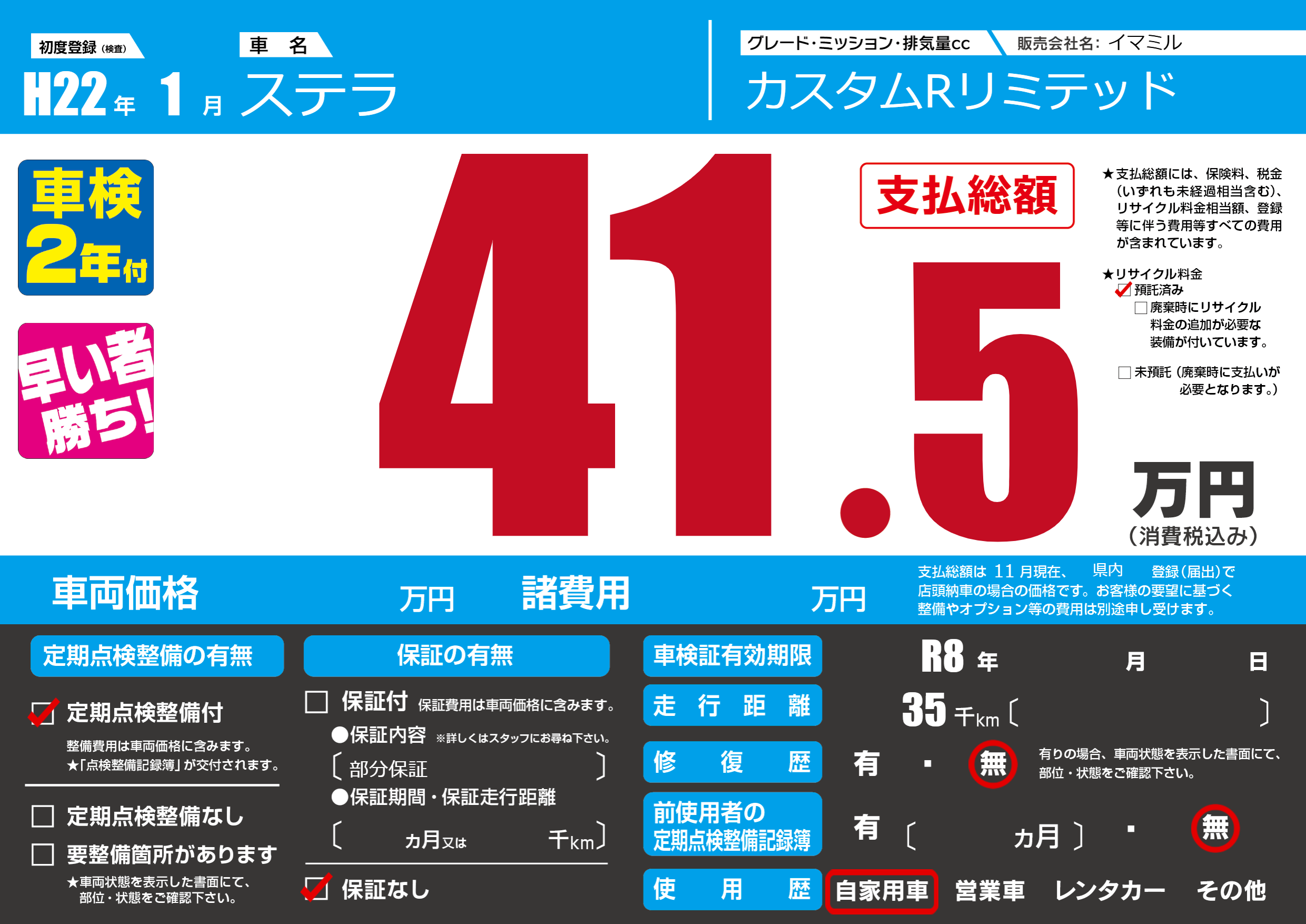 | 走行キロ | 3.5万km | 初年度登録 | H22年1月 |