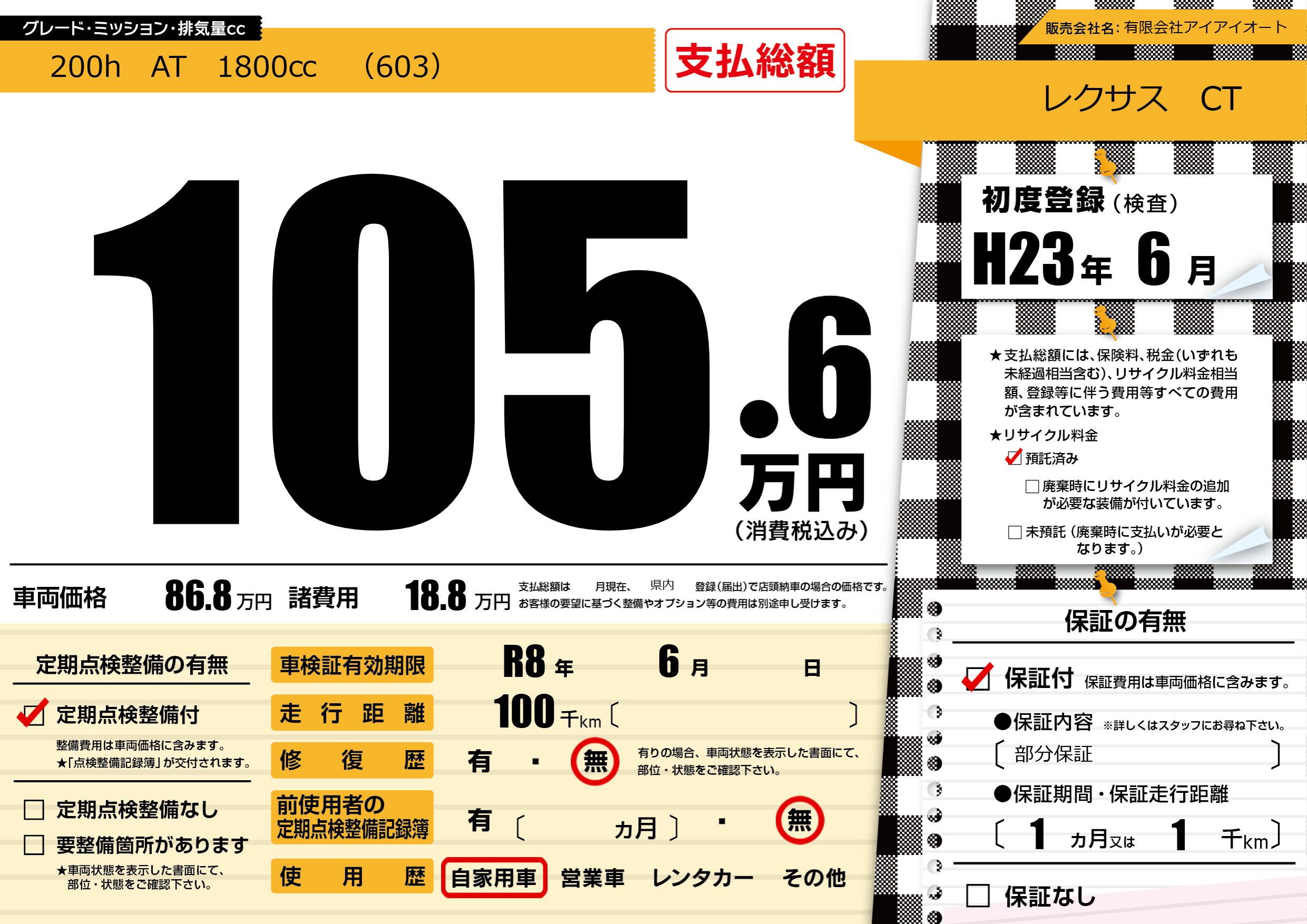 | 車名 | レクサス CT | グレード ミッション 排気量 |