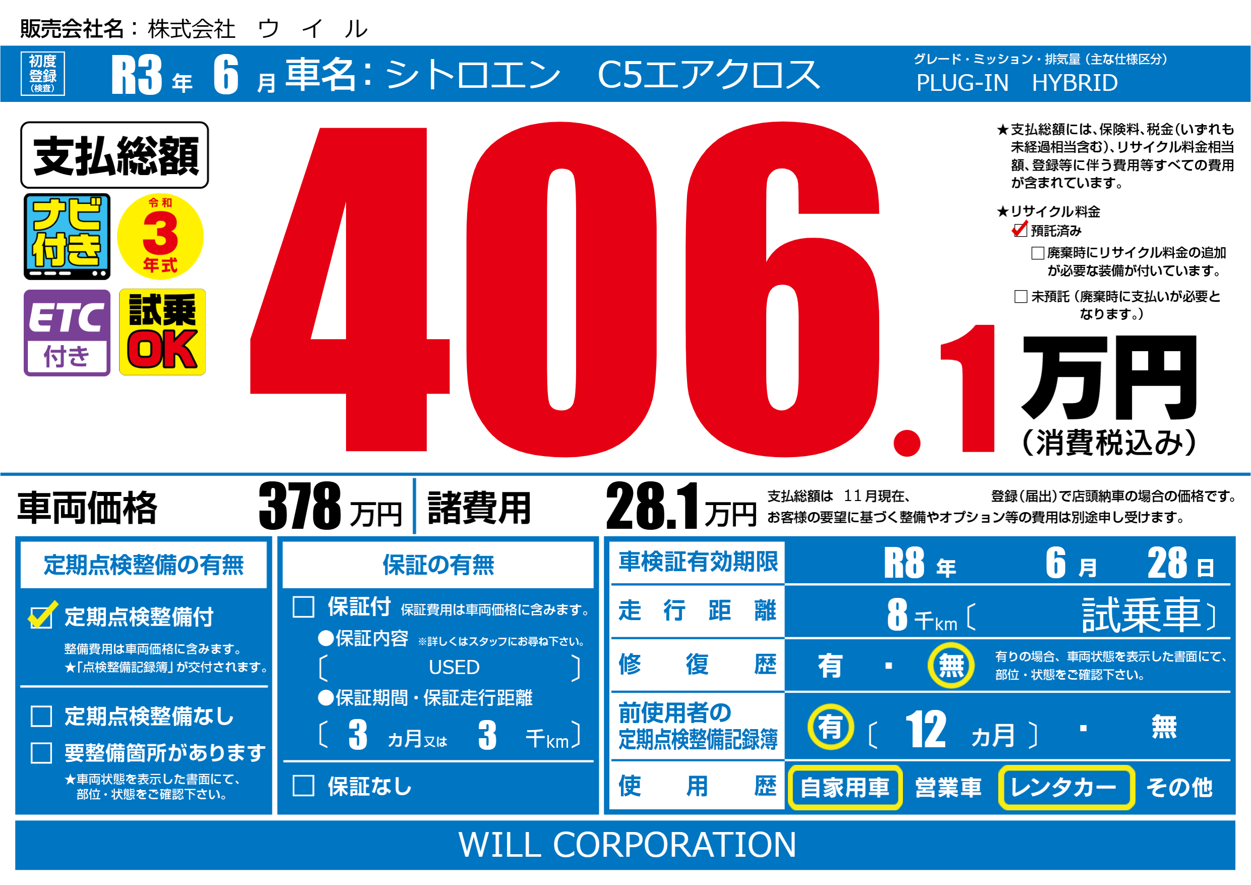 | 車名 | シトロエン C5エアクロス | グレード ミッション 排気量 |