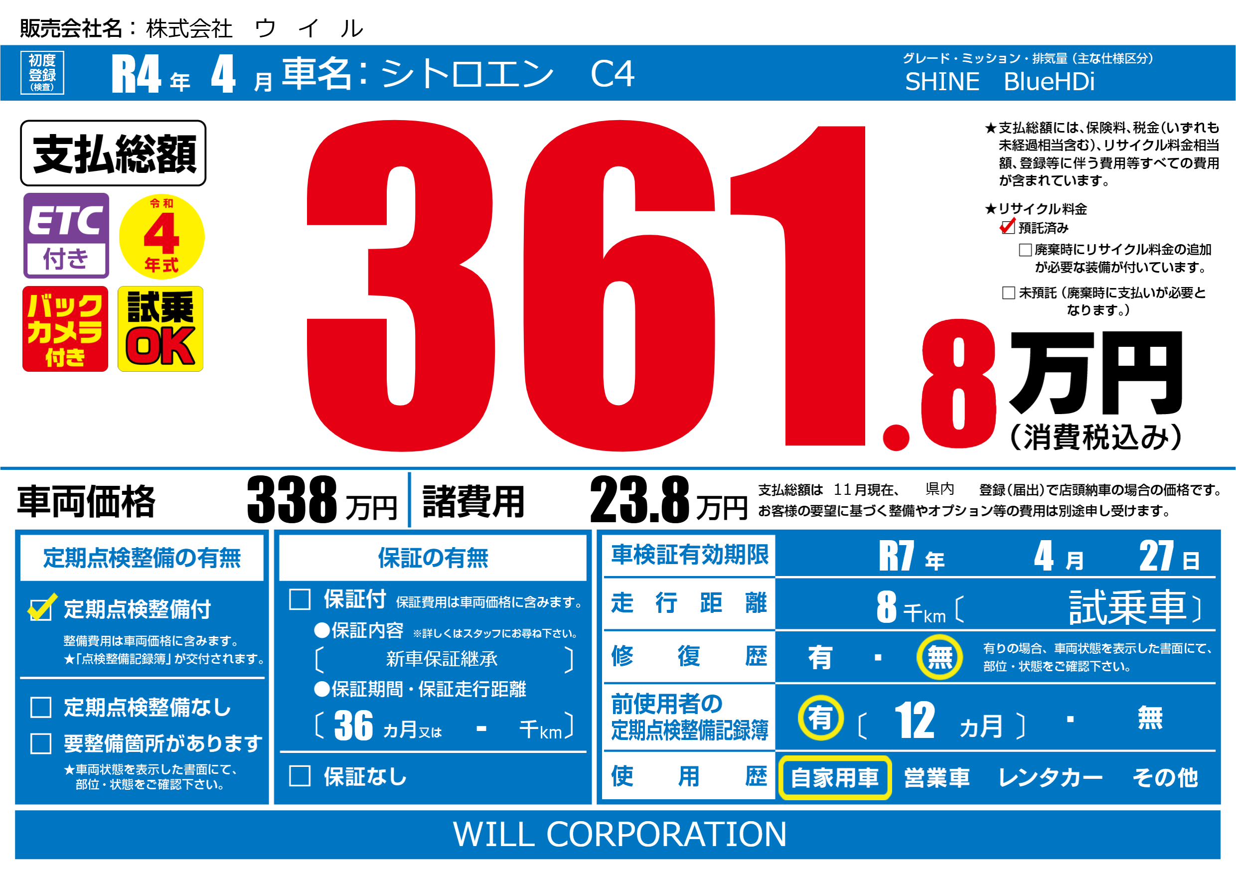 | 車名 | シトロエン C4 | グレード ミッション 排気量 |