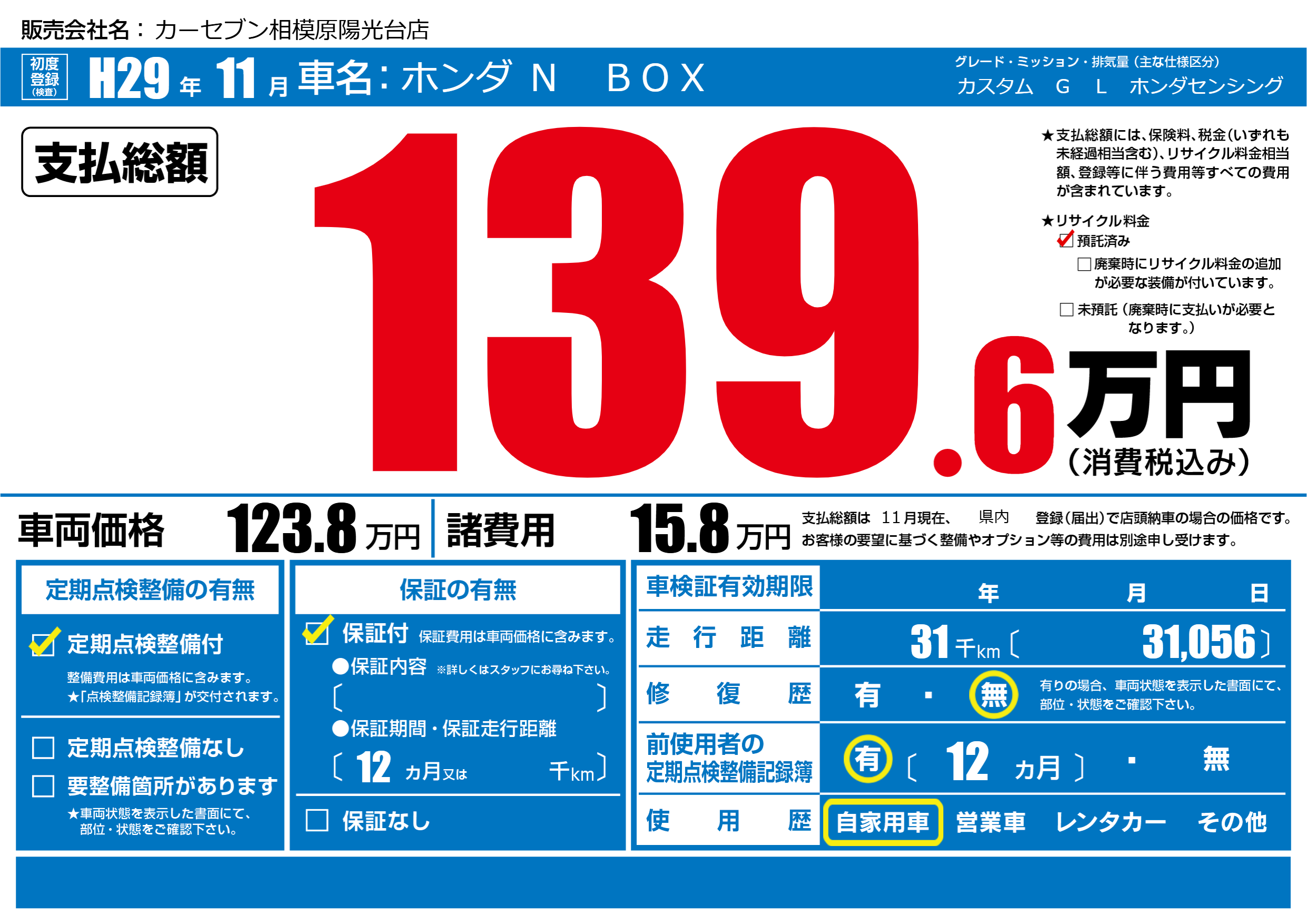 | 車名 | ホンダ N BOX | グレード ミッション 排気量 |