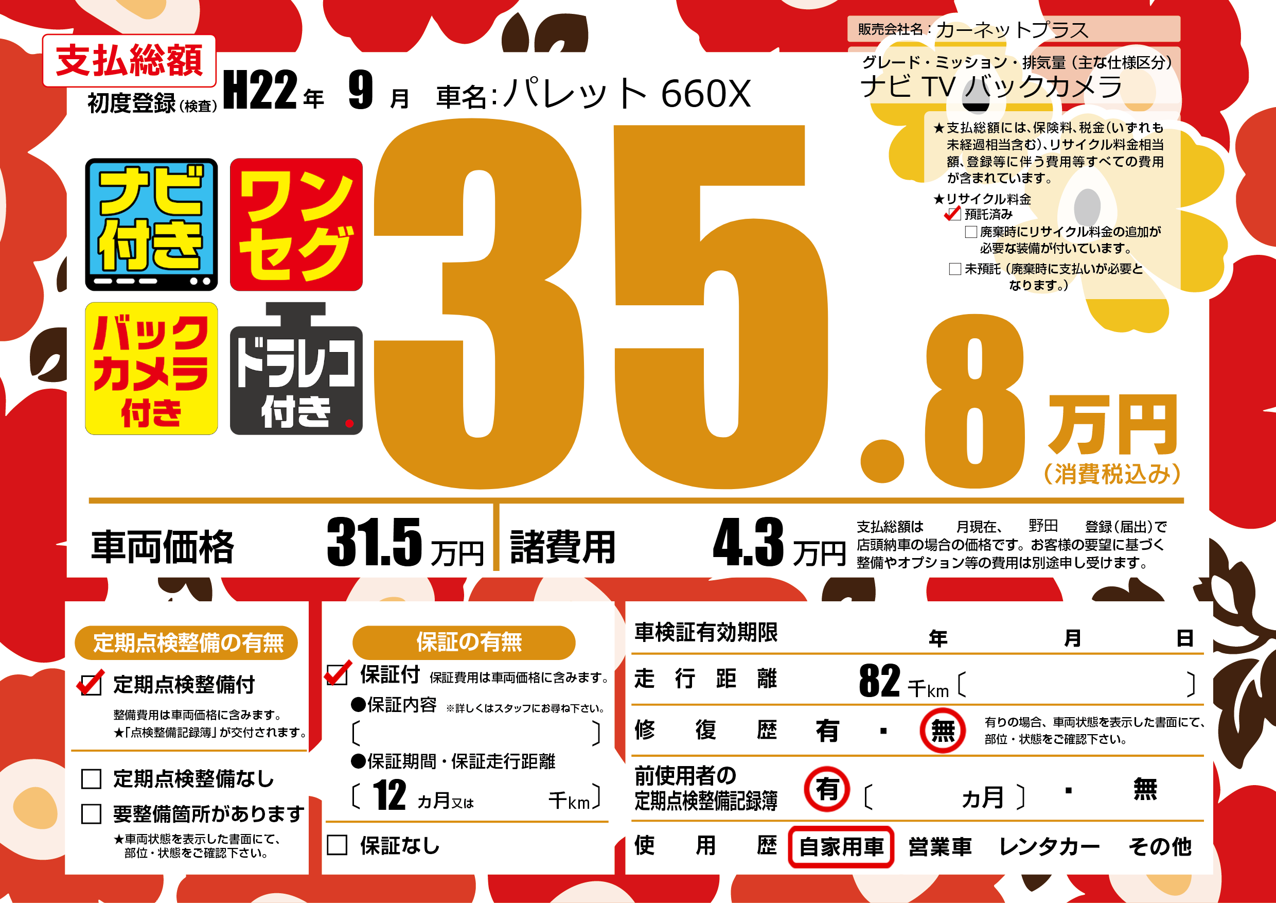 保証付き 保証内容(---) 12ヶ月または()千kmまで |
