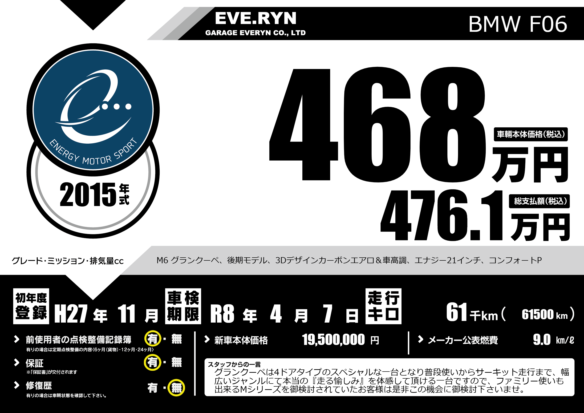 M6 グランクーペ、後期モデル、3Dデザインカーボンエアロ&車高調、エナジー21インチ、コンフォートP |