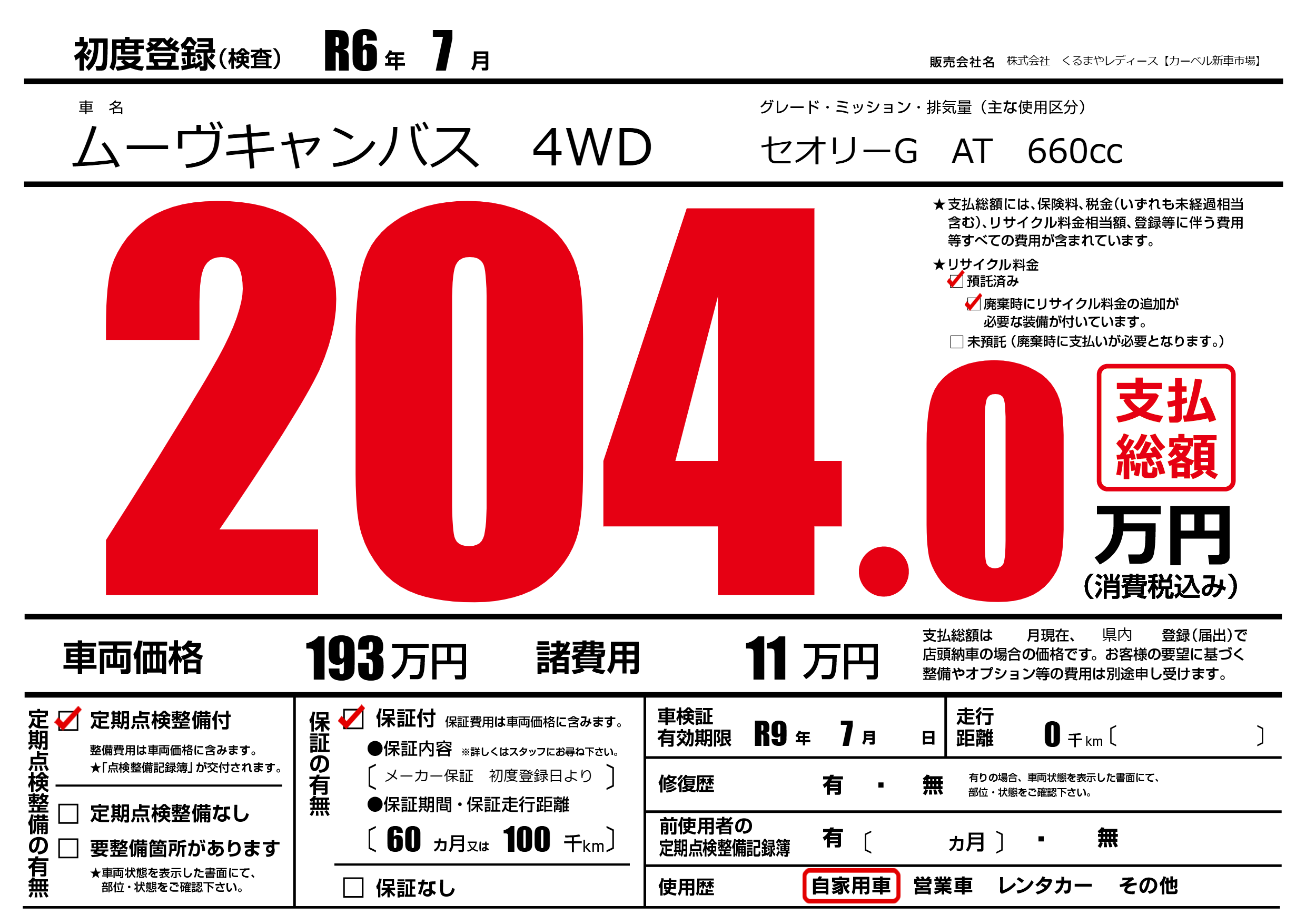 | 車名 | ムーヴキャンバス 4WD | グレード ミッション 排気量 |