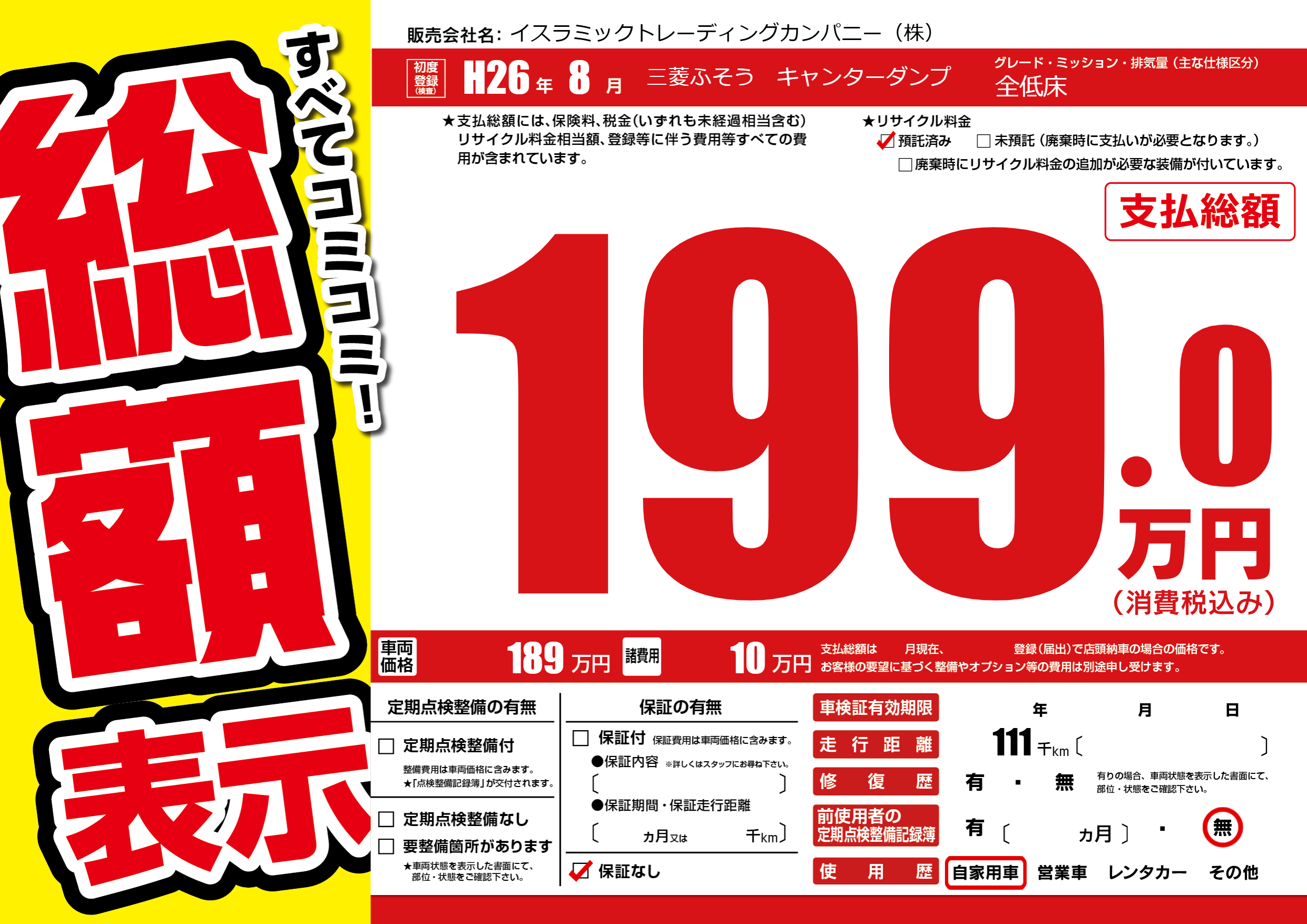 | 車名 | 三菱ふそう キャンターダンプ | グレード ミッション 排気量 |