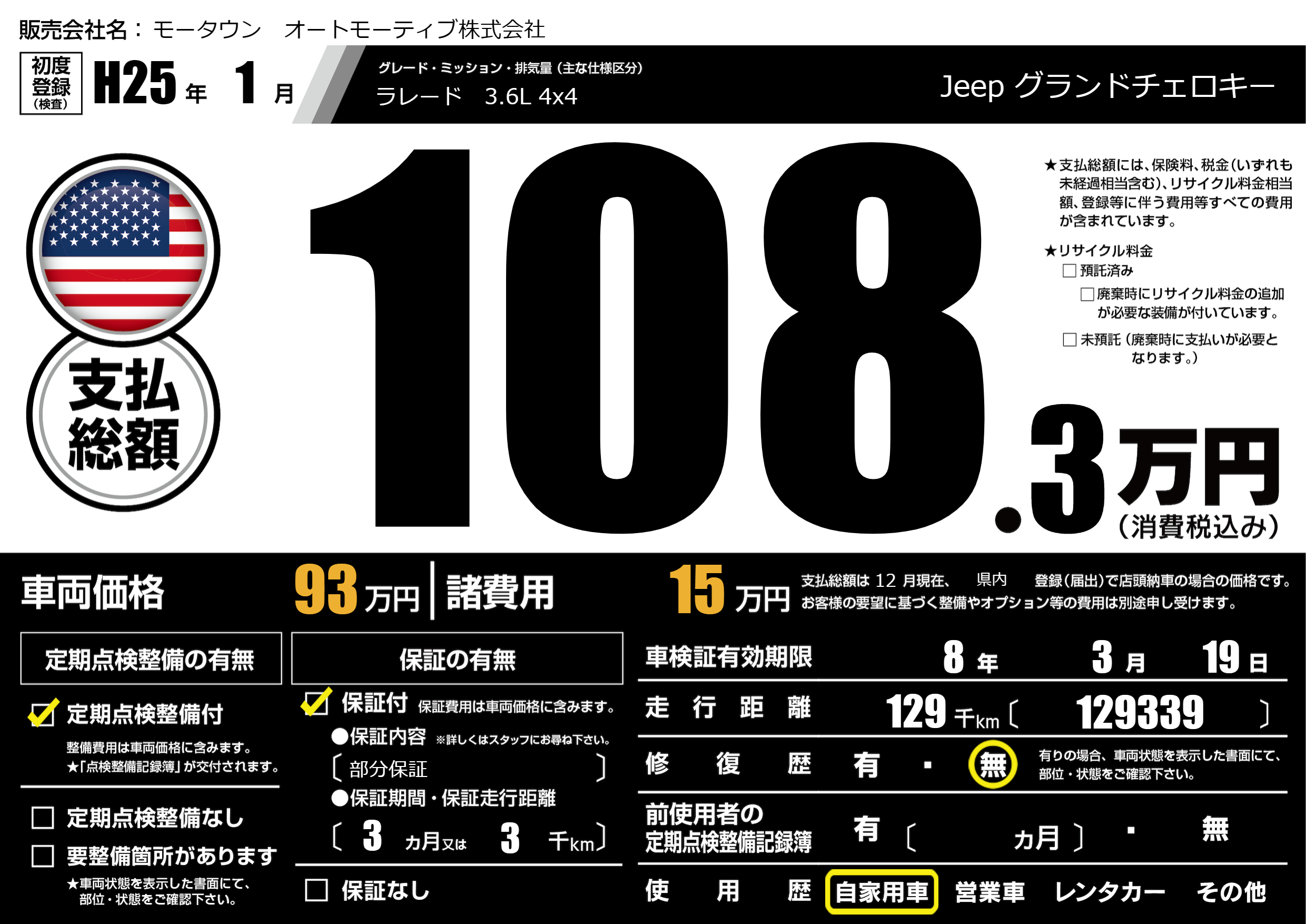 | 車名 | Jeep グランドチェロキー | グレード ミッション 排気量 |