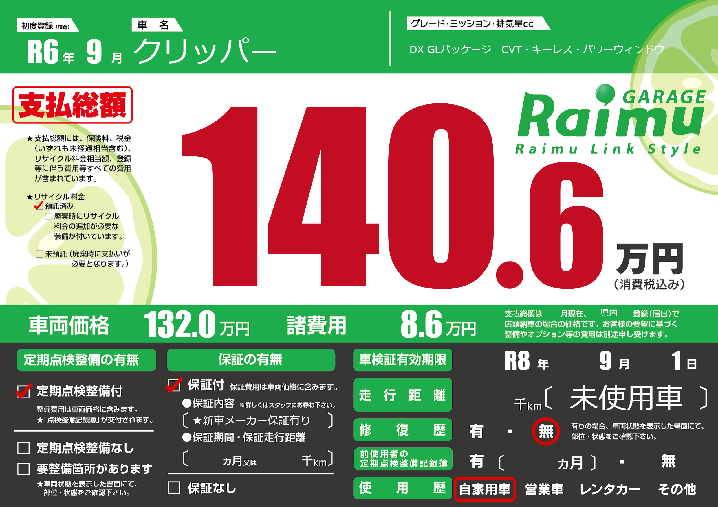 | 走行キロ | - | 初年度登録 | R6年9月 |