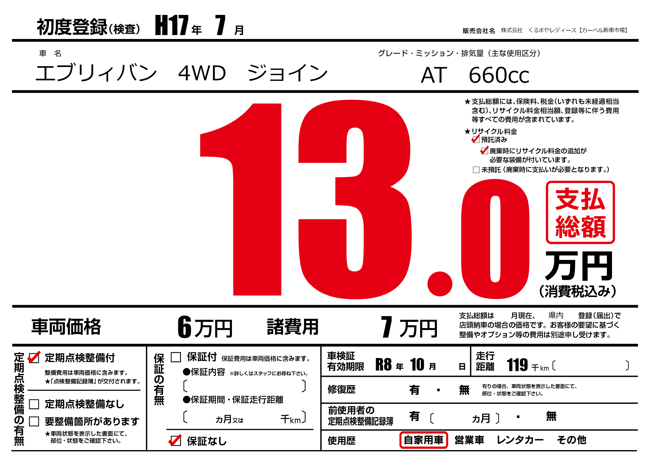 | 車名 | エブリィバン 4WD ジョイン | グレード ミッション 排気量 |