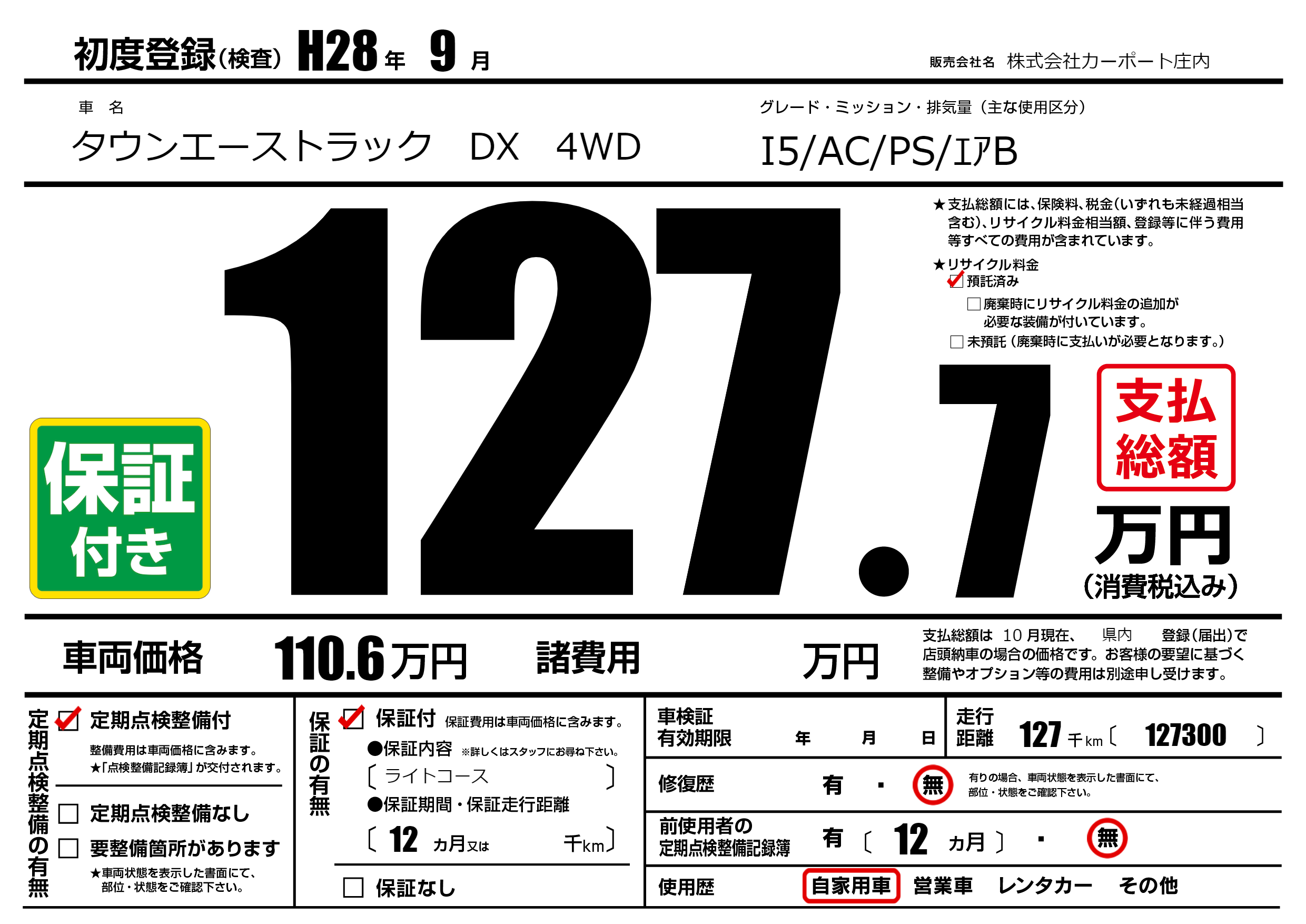 | 走行キロ | 12.7万km | 初年度登録 | H28年9月 |
