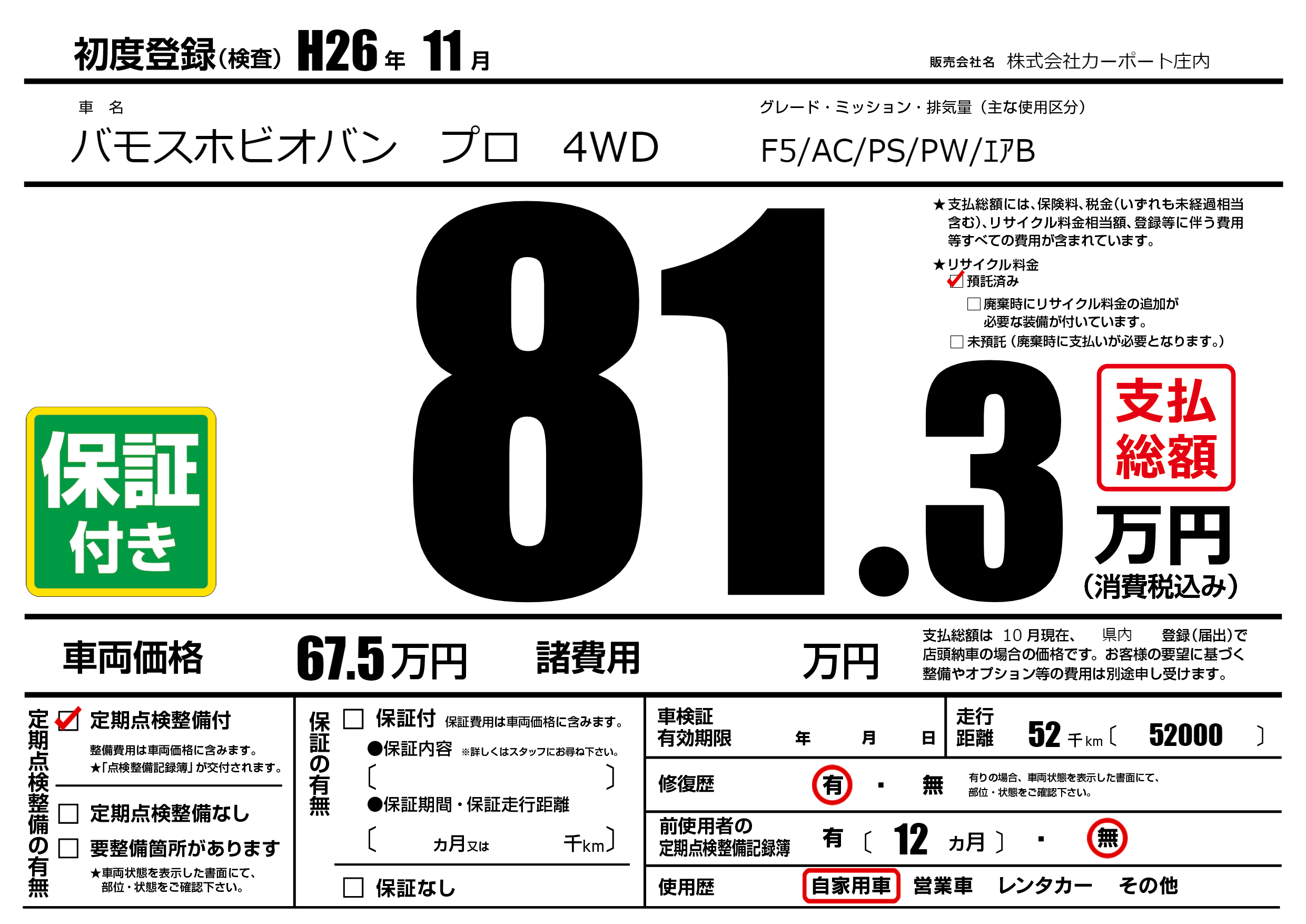 | 車名 | バモスホビオバン プロ 4WD | グレード ミッション 排気量 |