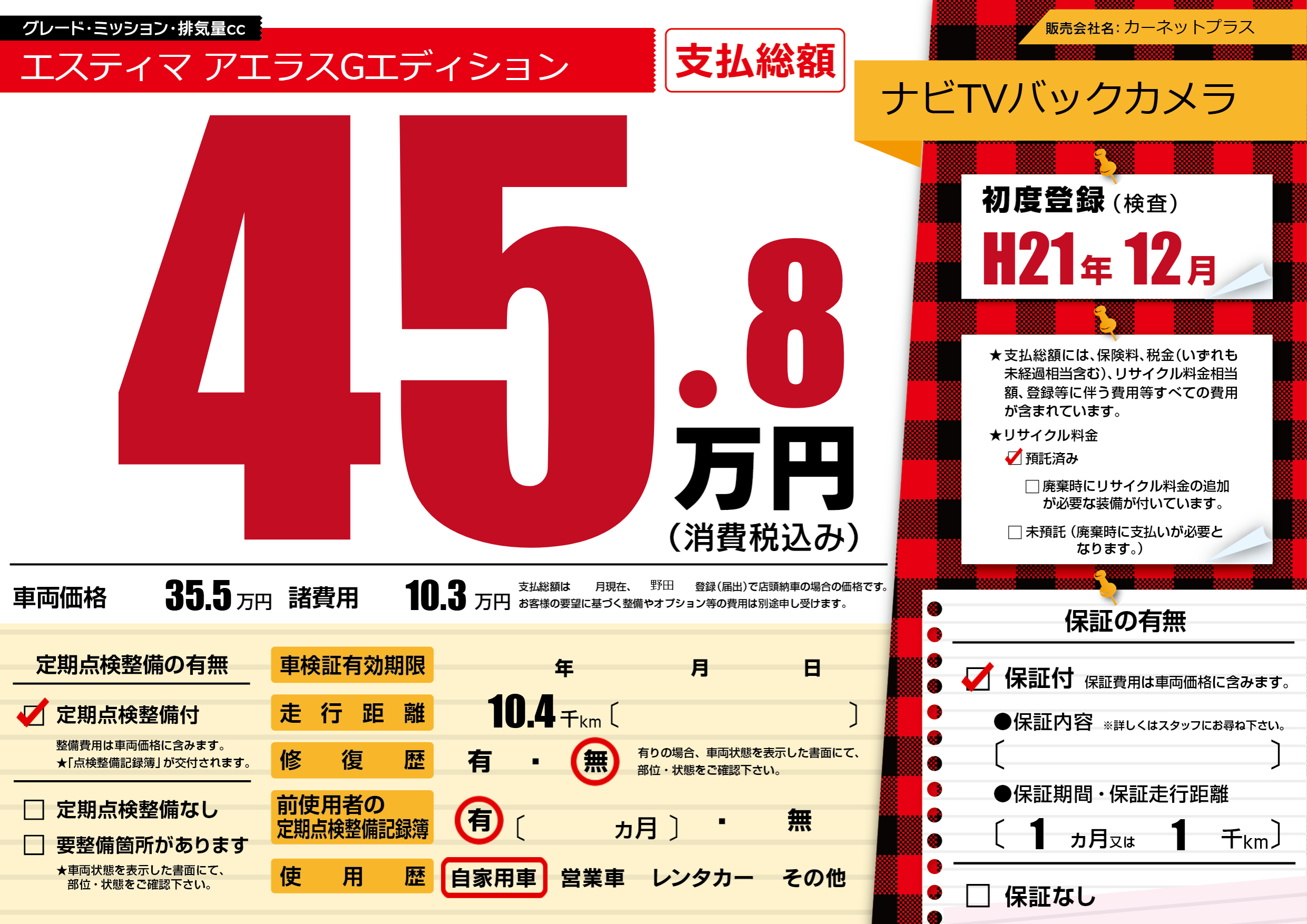 | 走行キロ | 1万km | 初年度登録 | H21年12月 |