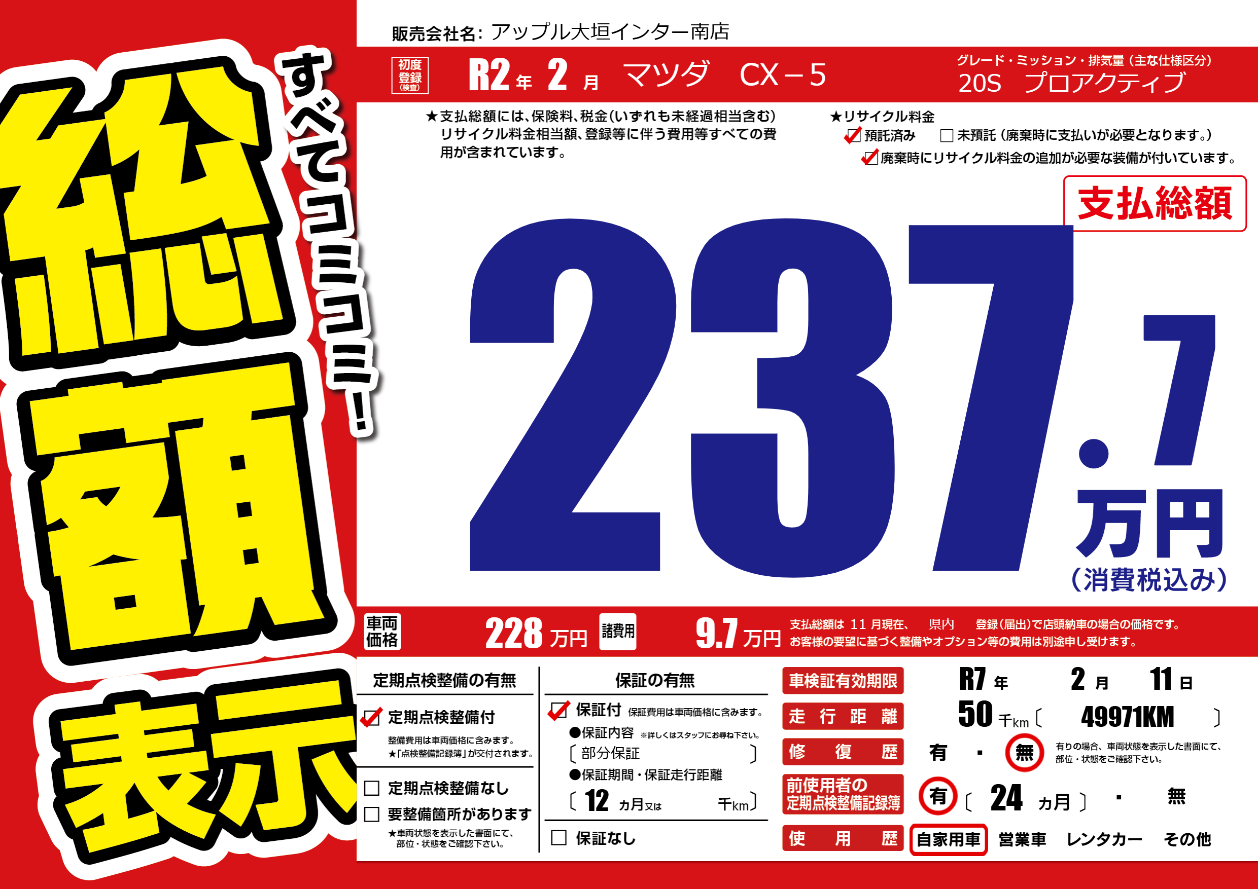 | 走行キロ | 5万km | 初年度登録 | R2年2月 |