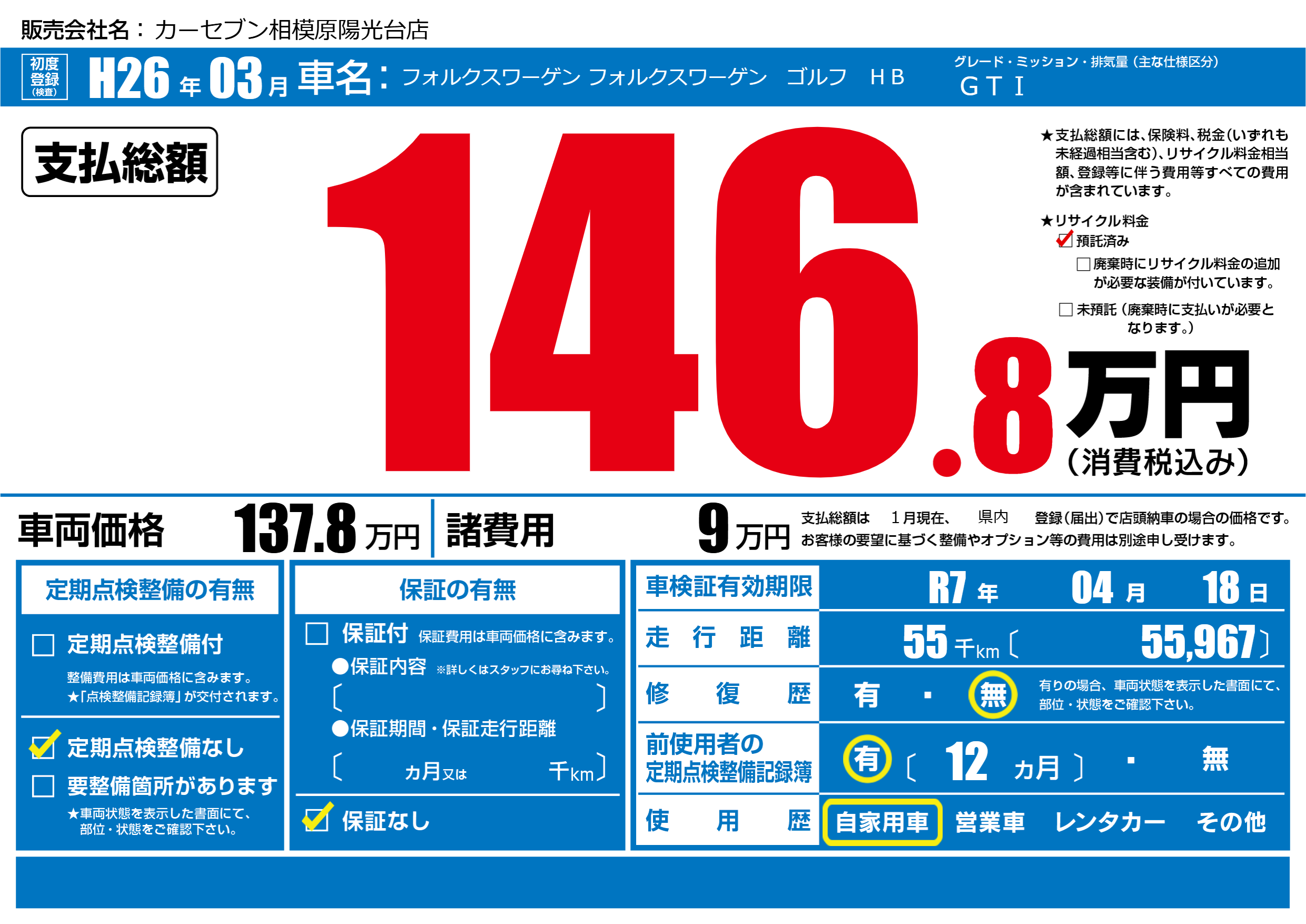 | 車検制限 | R7年 04月 18日 | ||