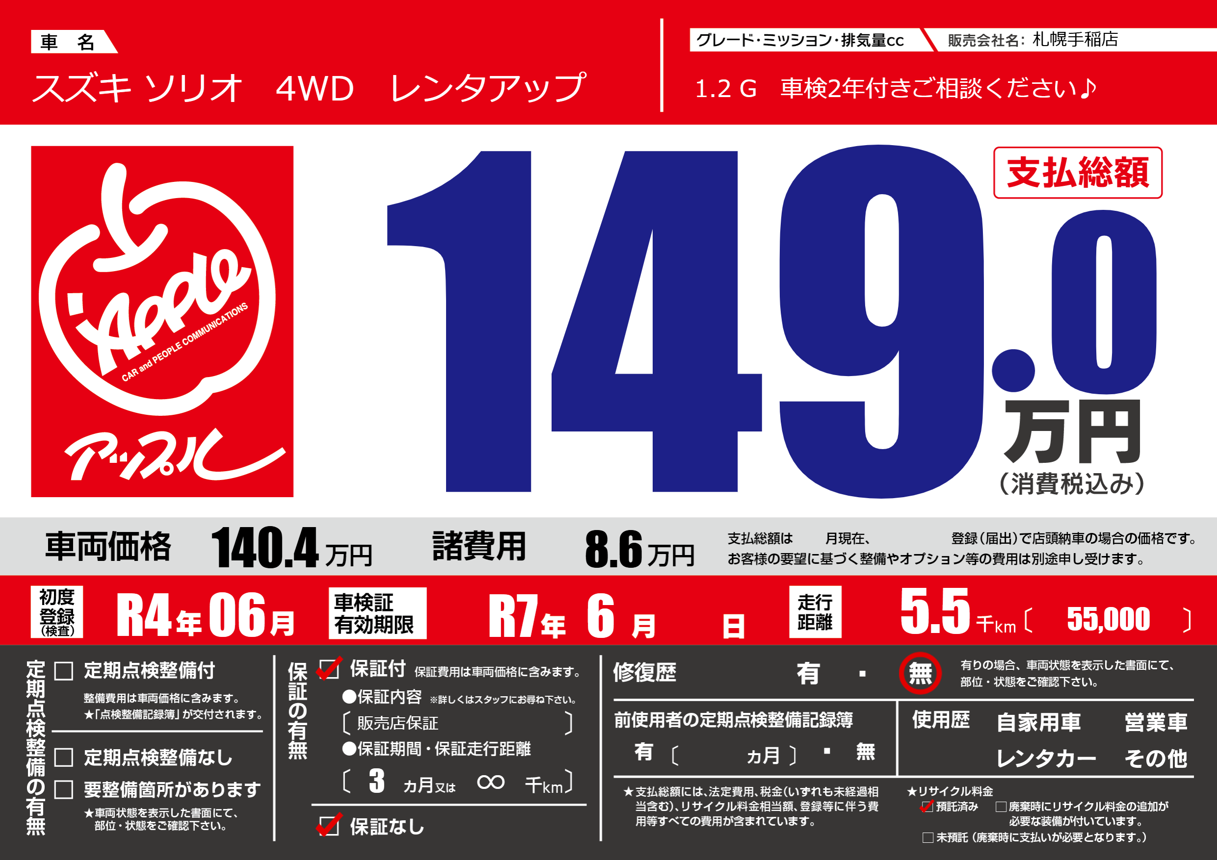 保証なし 保証内容(販売店保証) 3ヶ月または(∞)千kmまで |