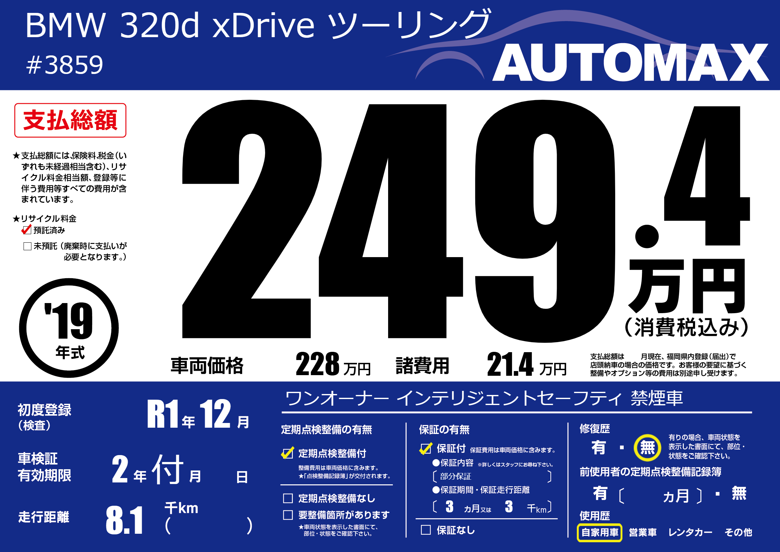 | 車名 | BMW 320d xDrive ツーリング | グレード ミッション 排気量 |