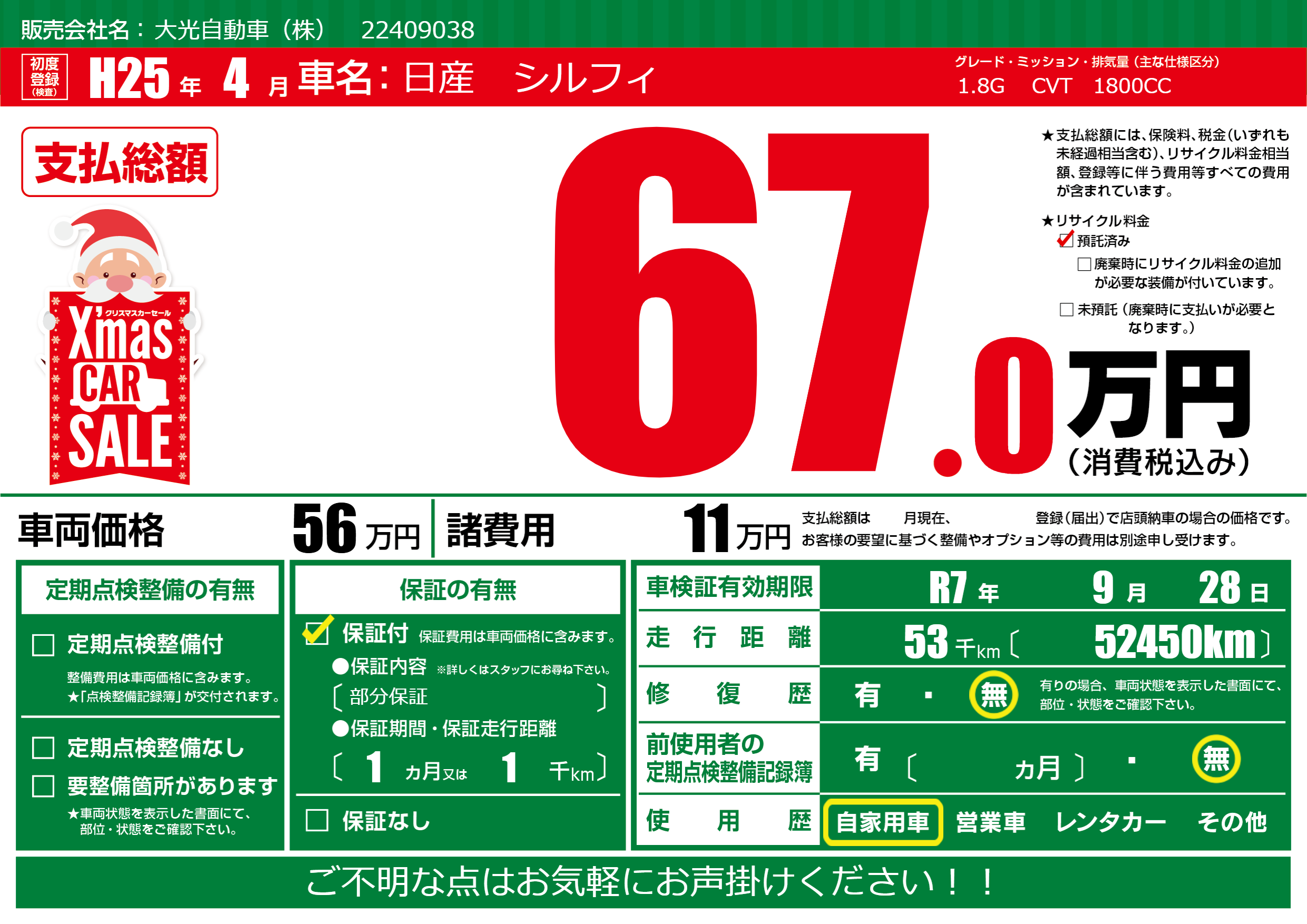 | 車検制限 | R7年 9月 28日 | ||