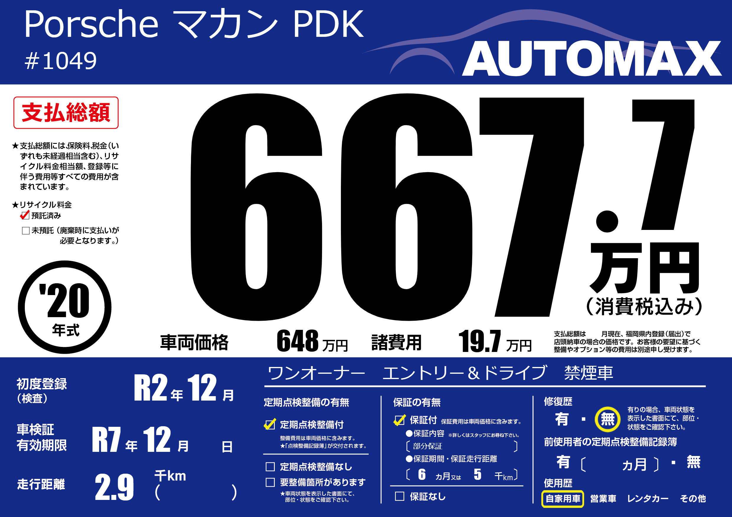 | 車名 | Porsche マカン PDK | グレード ミッション 排気量 |