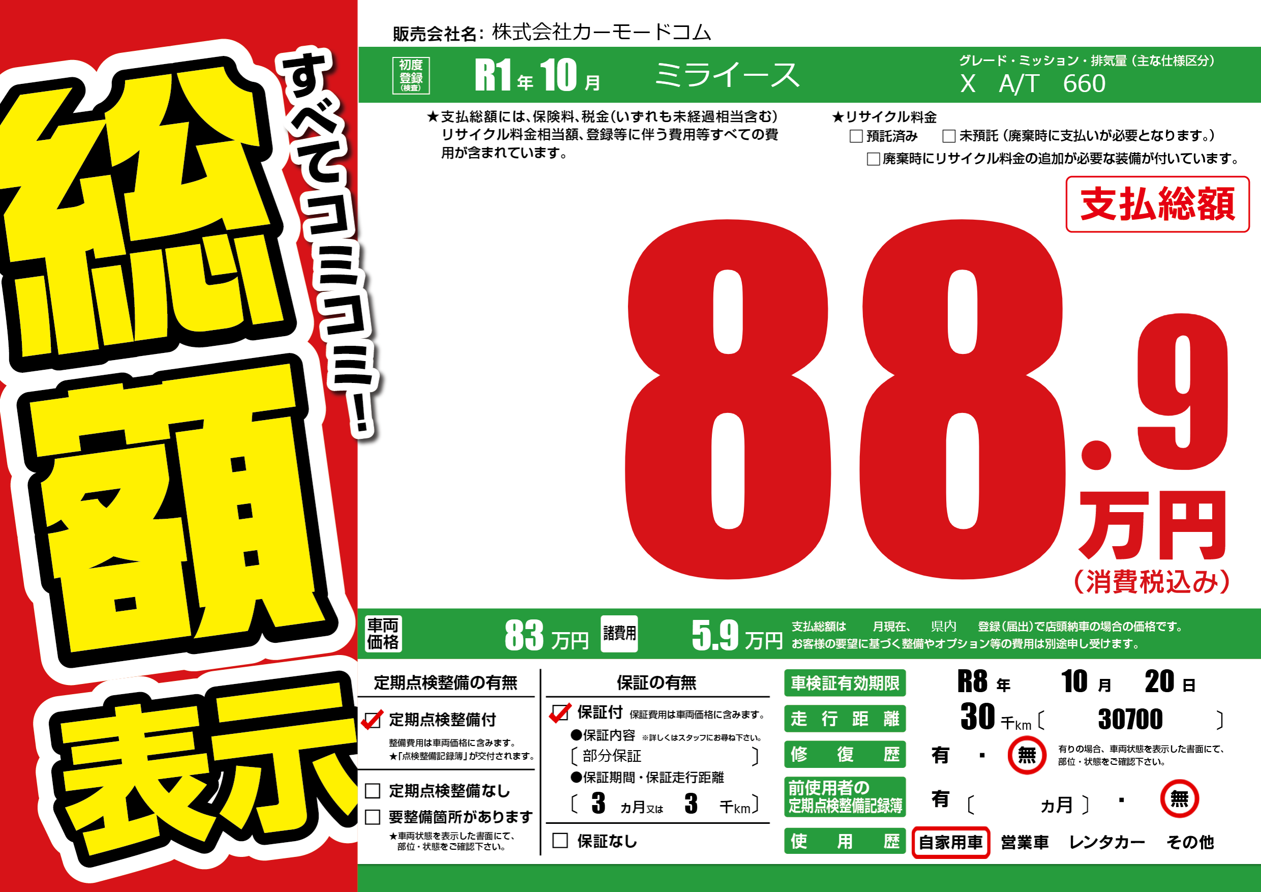| 走行キロ | 3万km | 初年度登録 | R1年10月 |