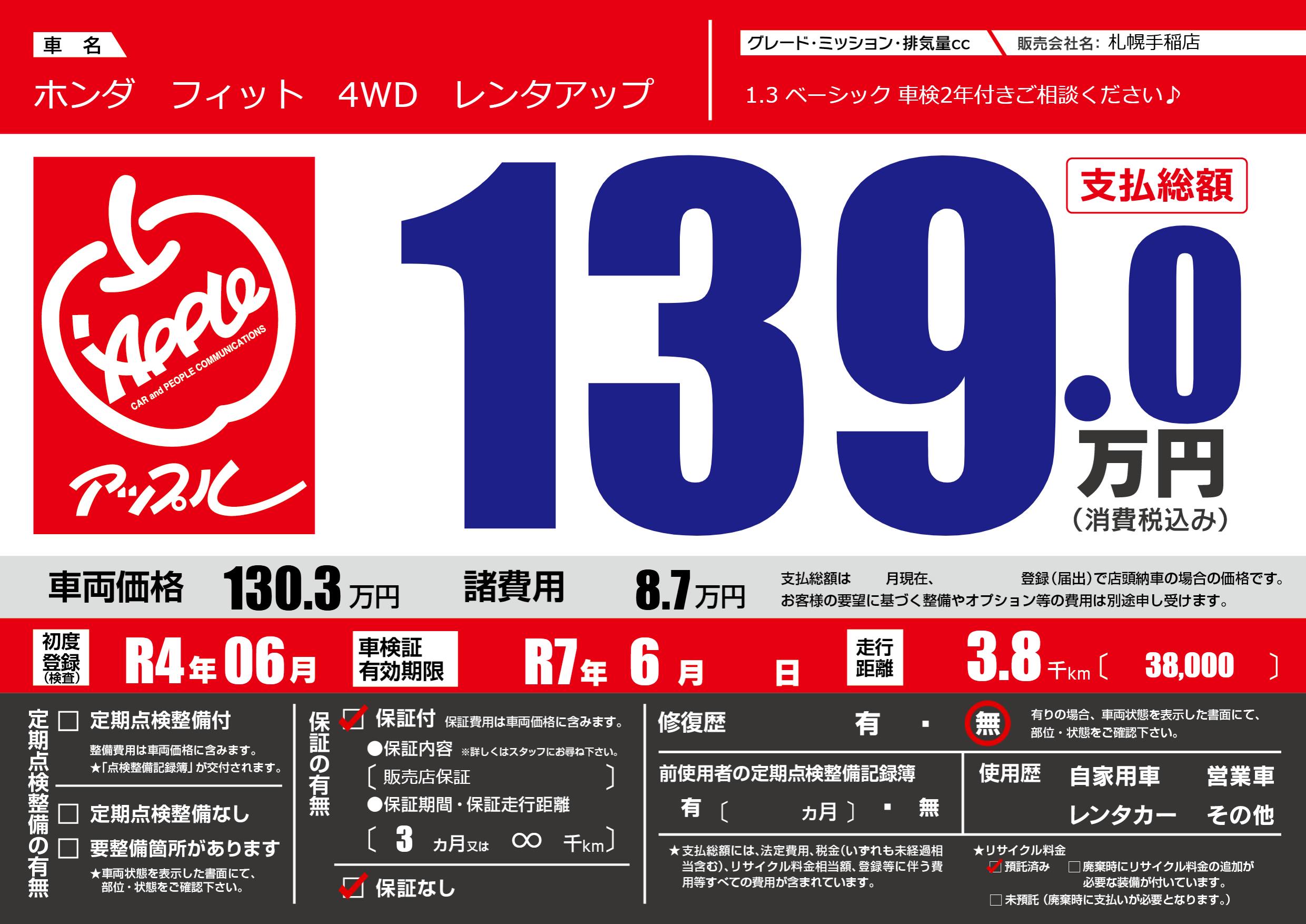 | 車名 | ホンダ フィット 4WD レンタアップ | グレード ミッション 排気量 |