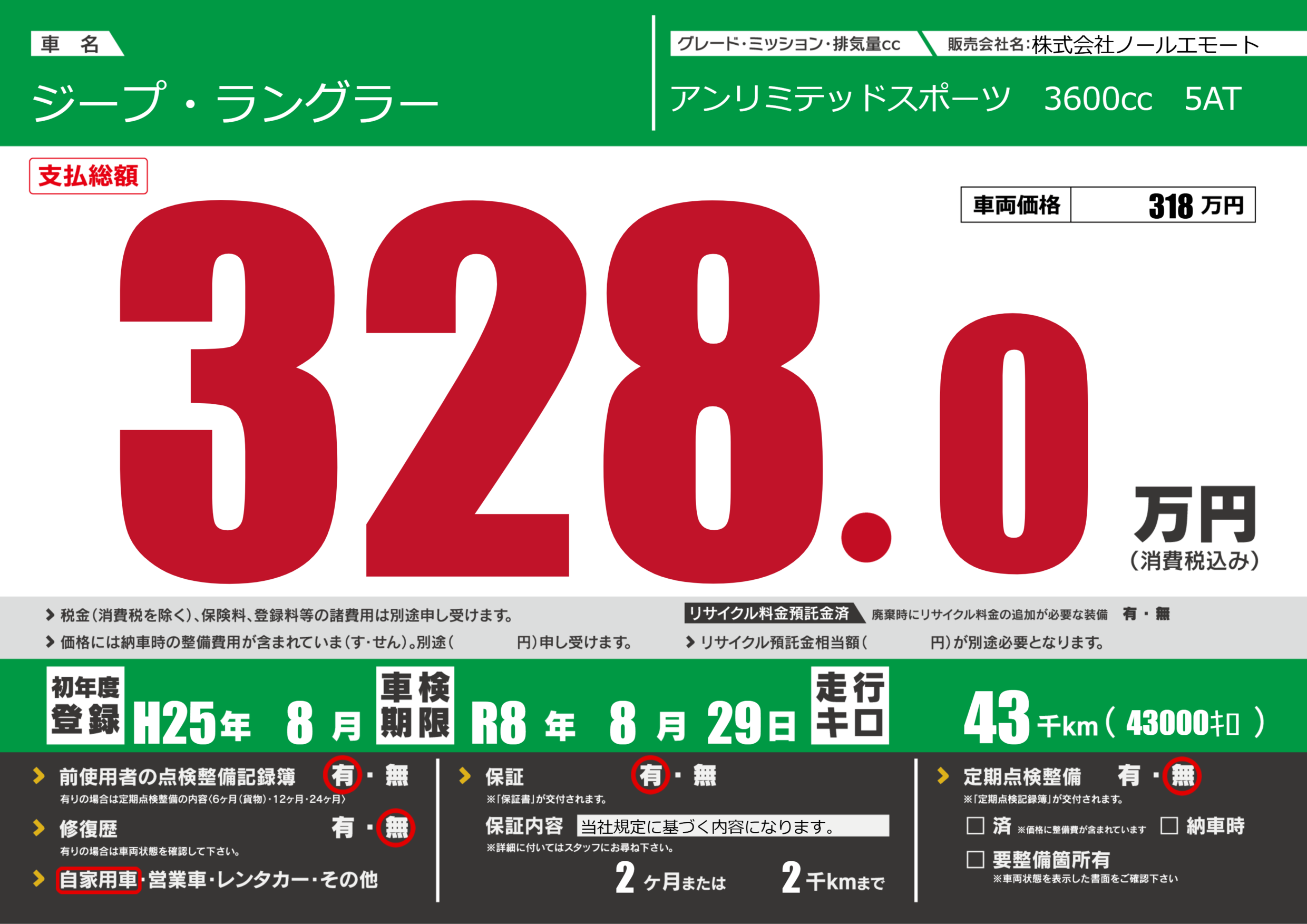 | 車名 | ジープ・ラングラー | グレード ミッション 排気量 |