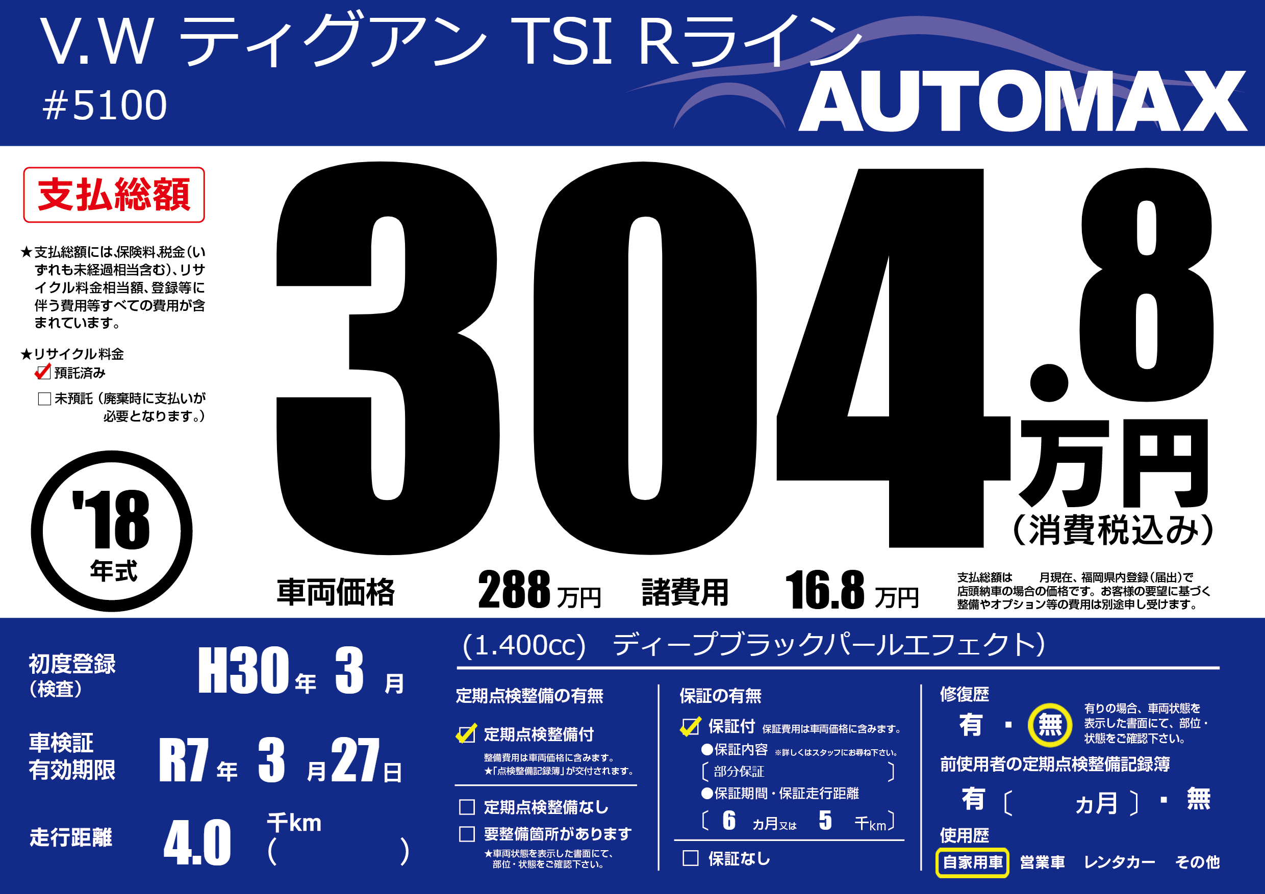 | 車名 | V.W ティグアン TSI Rライン | グレード ミッション 排気量 |